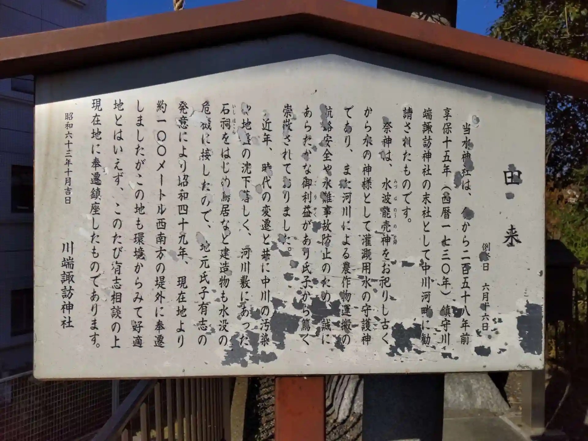 立石を走って巡りあった社です。中川沿いの川端南遊園の中に鎮座されています。川端諏訪神社の社外末社とのこと。小さな社ですが、参道の案内板もありました。