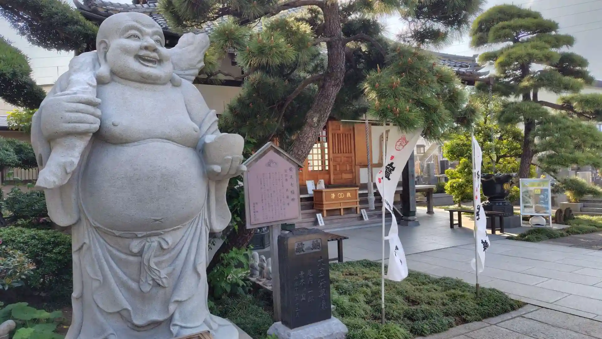 京成電鉄の線路沿いに柴又を目指すと、右手に良観寺があるので立ち寄ってお参り。柴又七福神の布袋さまの寺。大きな布袋像があり、腹をさすると良いとのことなのでさする。