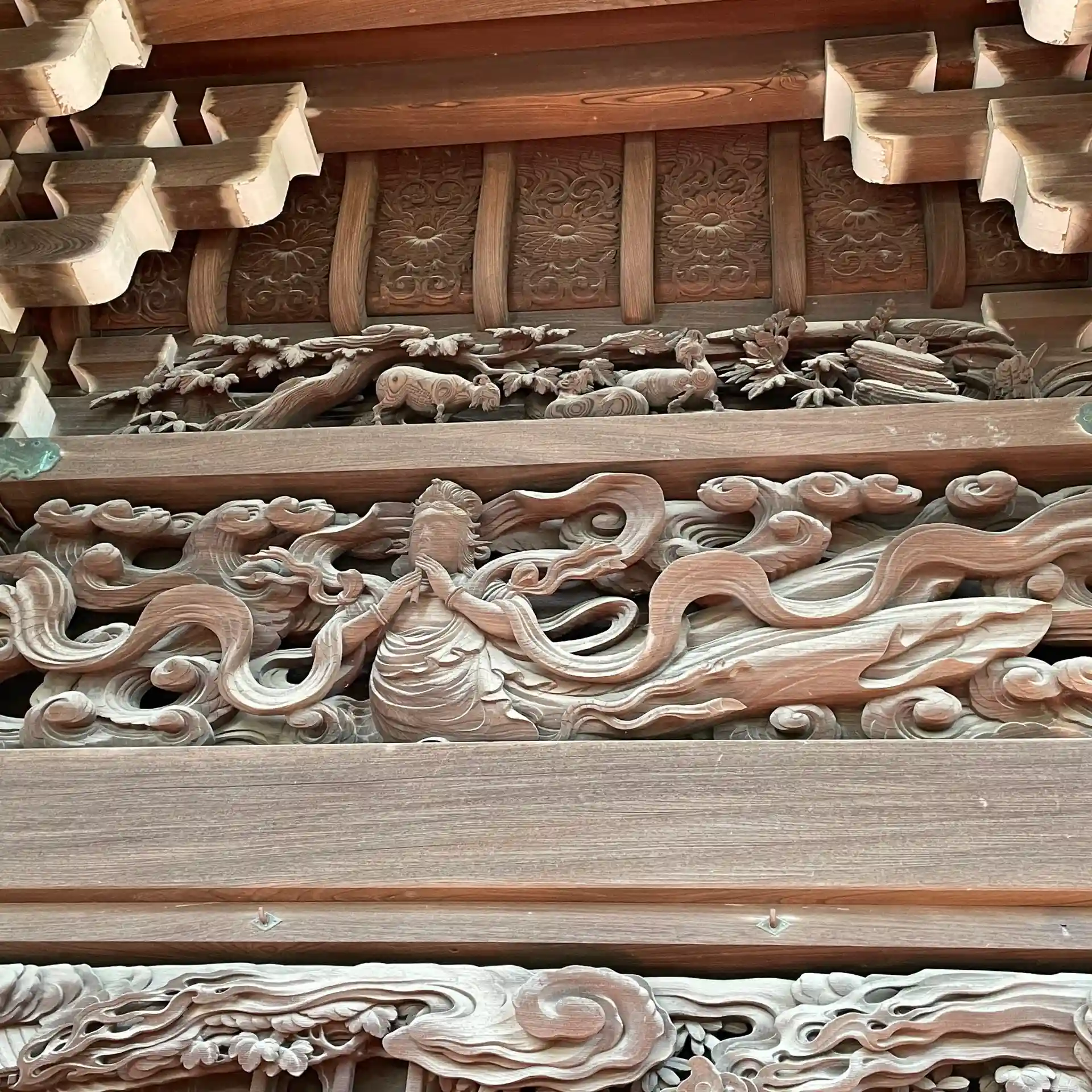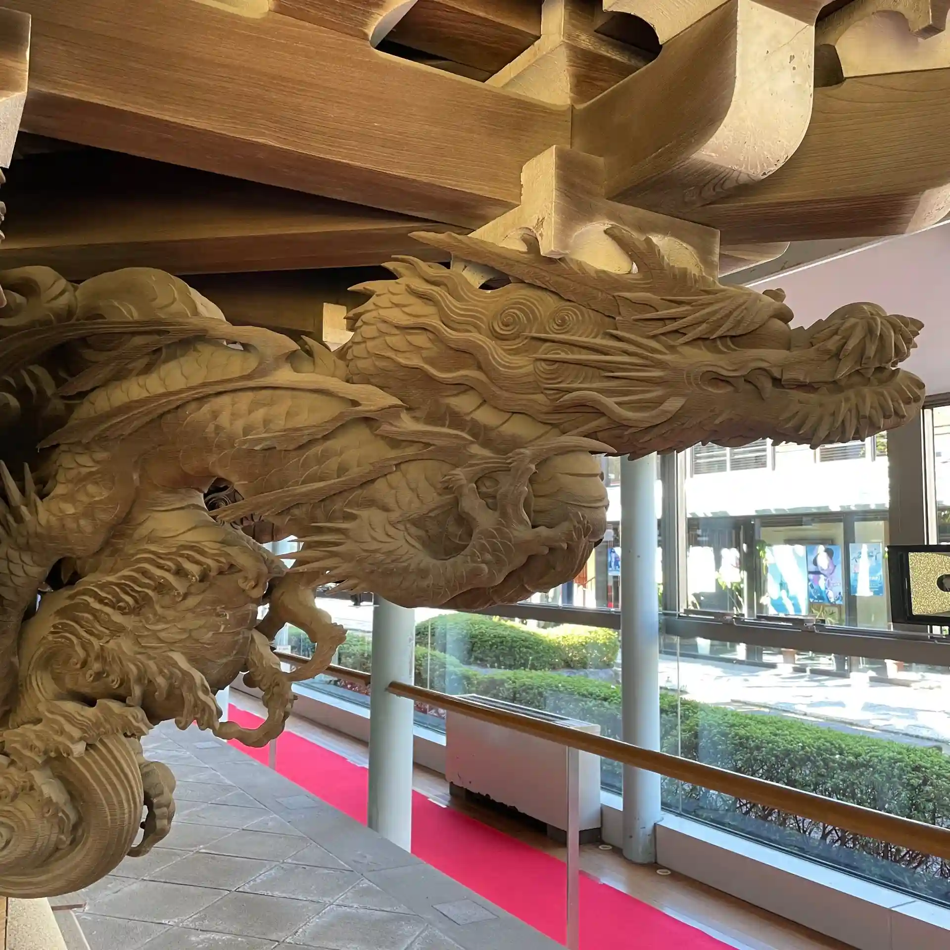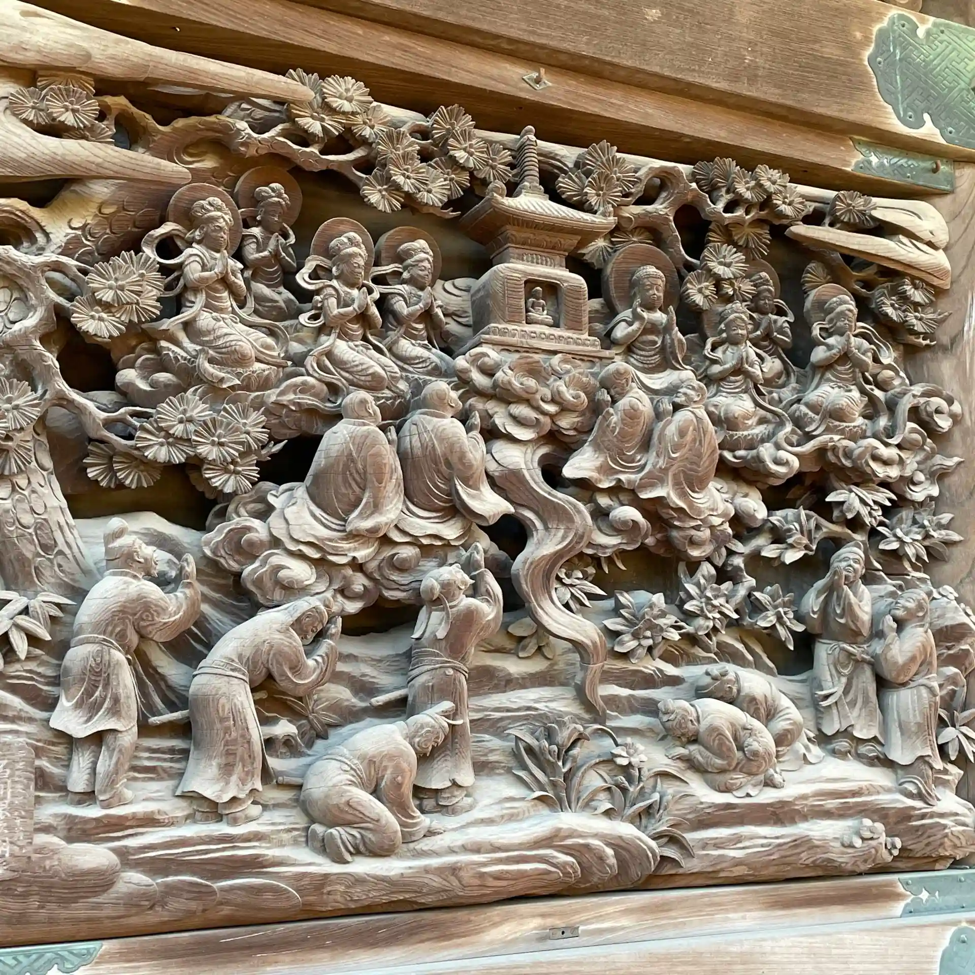 今日は、前から気になってた庭園と彫刻を見に行きました。庭園はよく整備されており、青空に木々が映えて綺麗でした。彫刻は、本堂後方の壁画を間近で眺められます。法華経の各品を彫刻で表現しており、細部まで丁寧に作られていました。