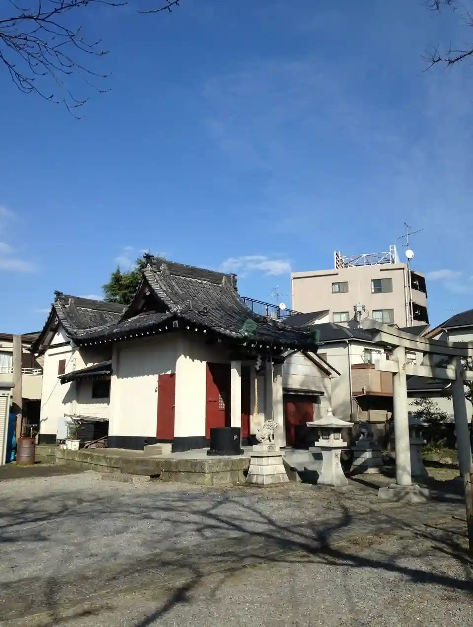 社殿の左手奥には、町内会館を兼ねた社務所の建物が見えます。行事の際には、地域の人々がここに集い、準備や神事を行っているのでしょう。また社殿の左側には、境内の規模に対して驚くほど広々とした空間が広がっています。舗装された地面と空を遮るものの少ない開放的な一角で、近隣の子どもたちが遊ぶ姿や、地域行事が行われる光景が目に浮かびます。