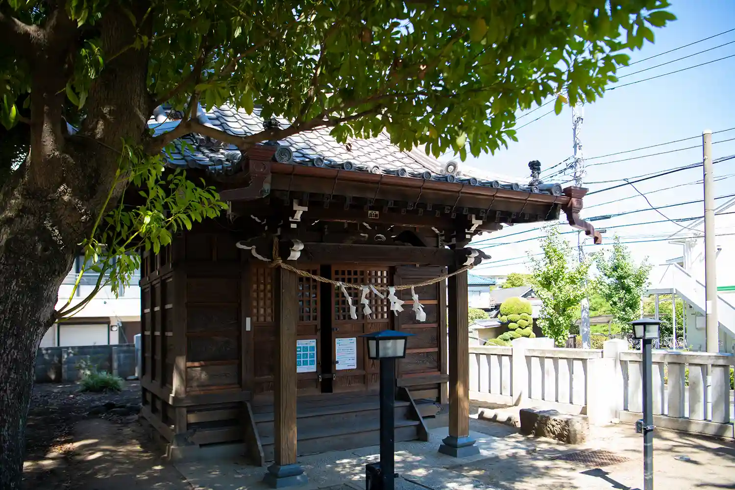 開けた境内に趣のある社殿、神楽殿。