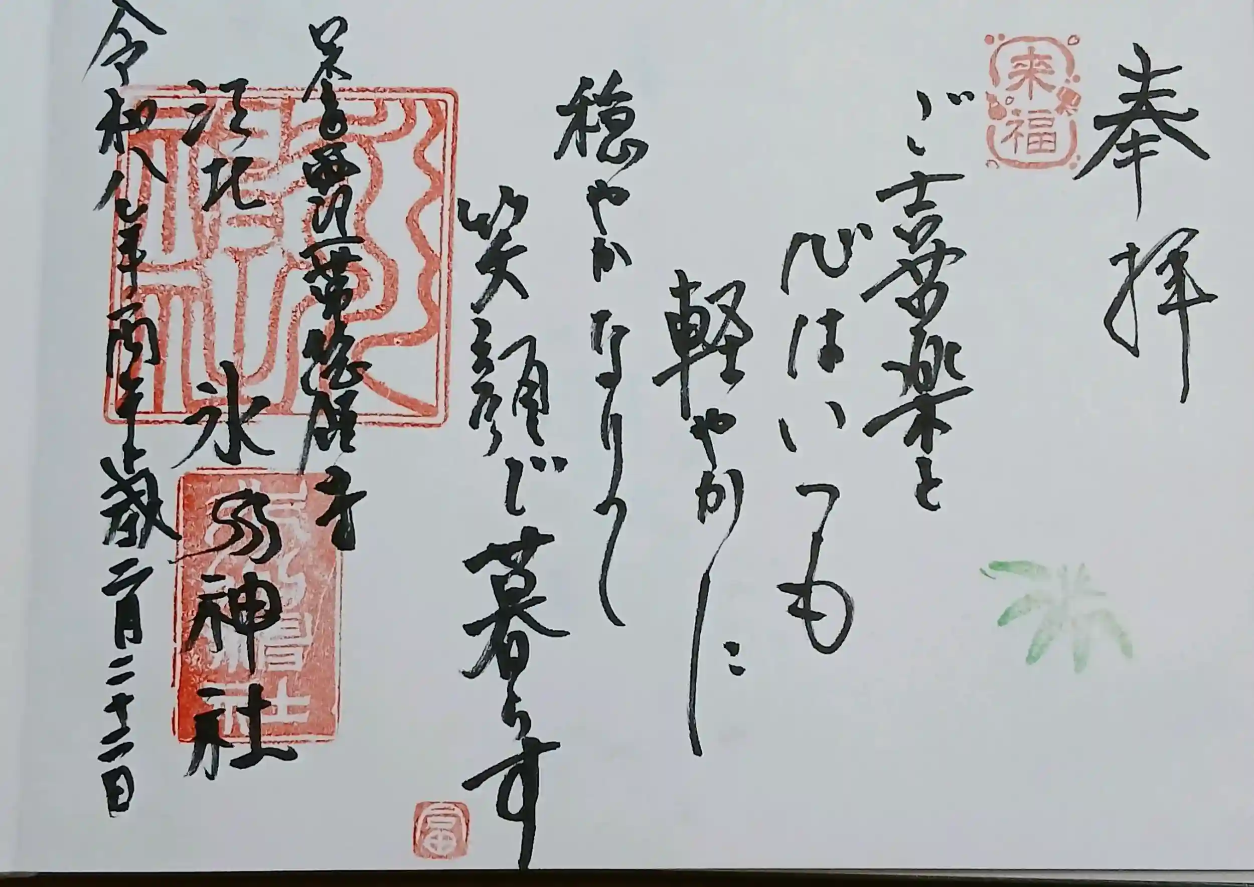 女性の名誉宮司·八木冨美子さんにお書き入れいただく短歌御朱印を拝受してまいりました。