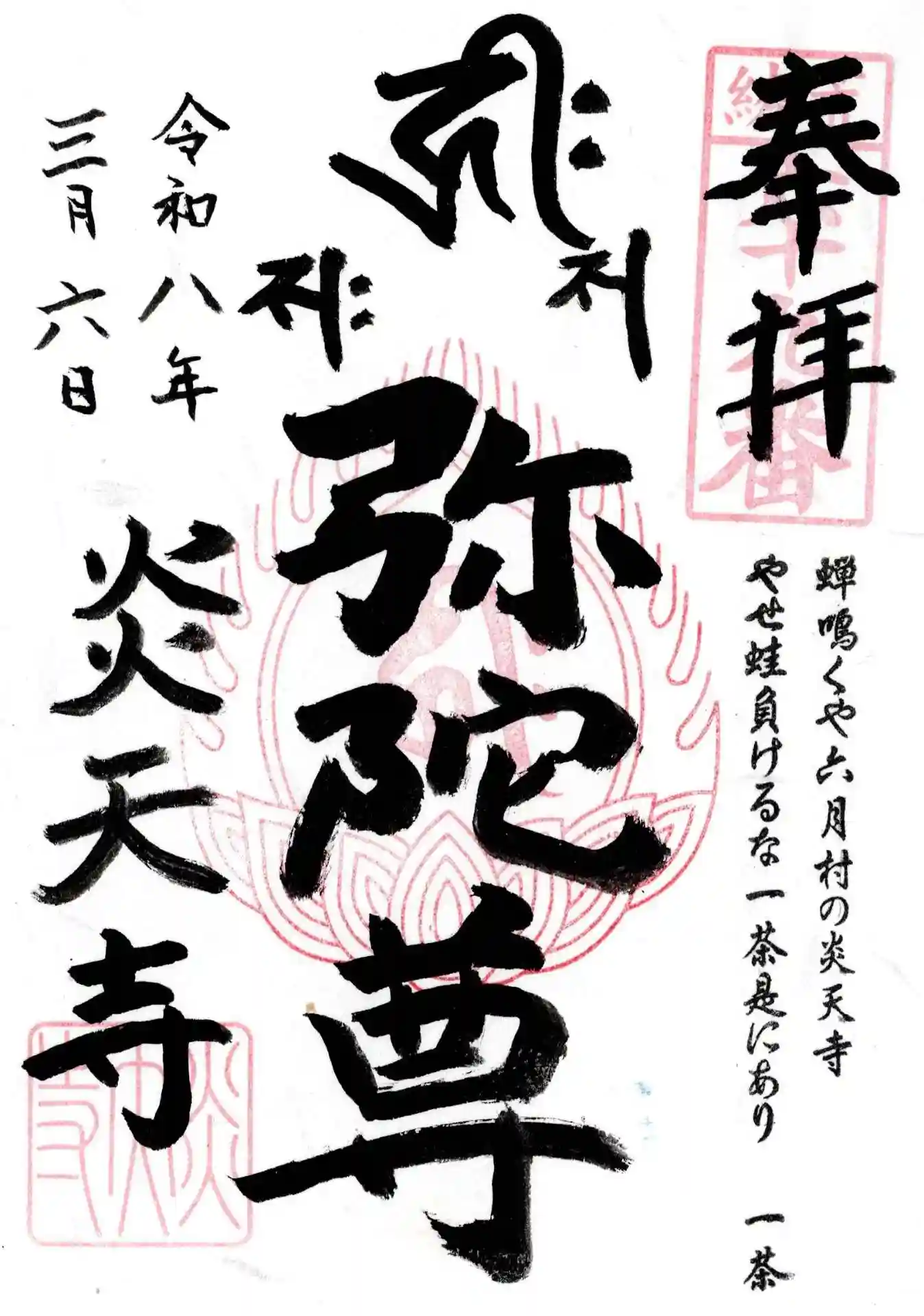 いただいた御朱印には、本尊である「弥陀尊」の力強い墨書きとともに、一茶の句が添えられており、参拝の思い出をより深いものにしてくれました。令和八年三月六日の日付とともに刻まれた「炎天寺」の名は、かつて源義光が炎天下で戦ったという由来を持ちながらも、今の境内は蛙たちが休む穏やかで優しい空気に包まれていました。