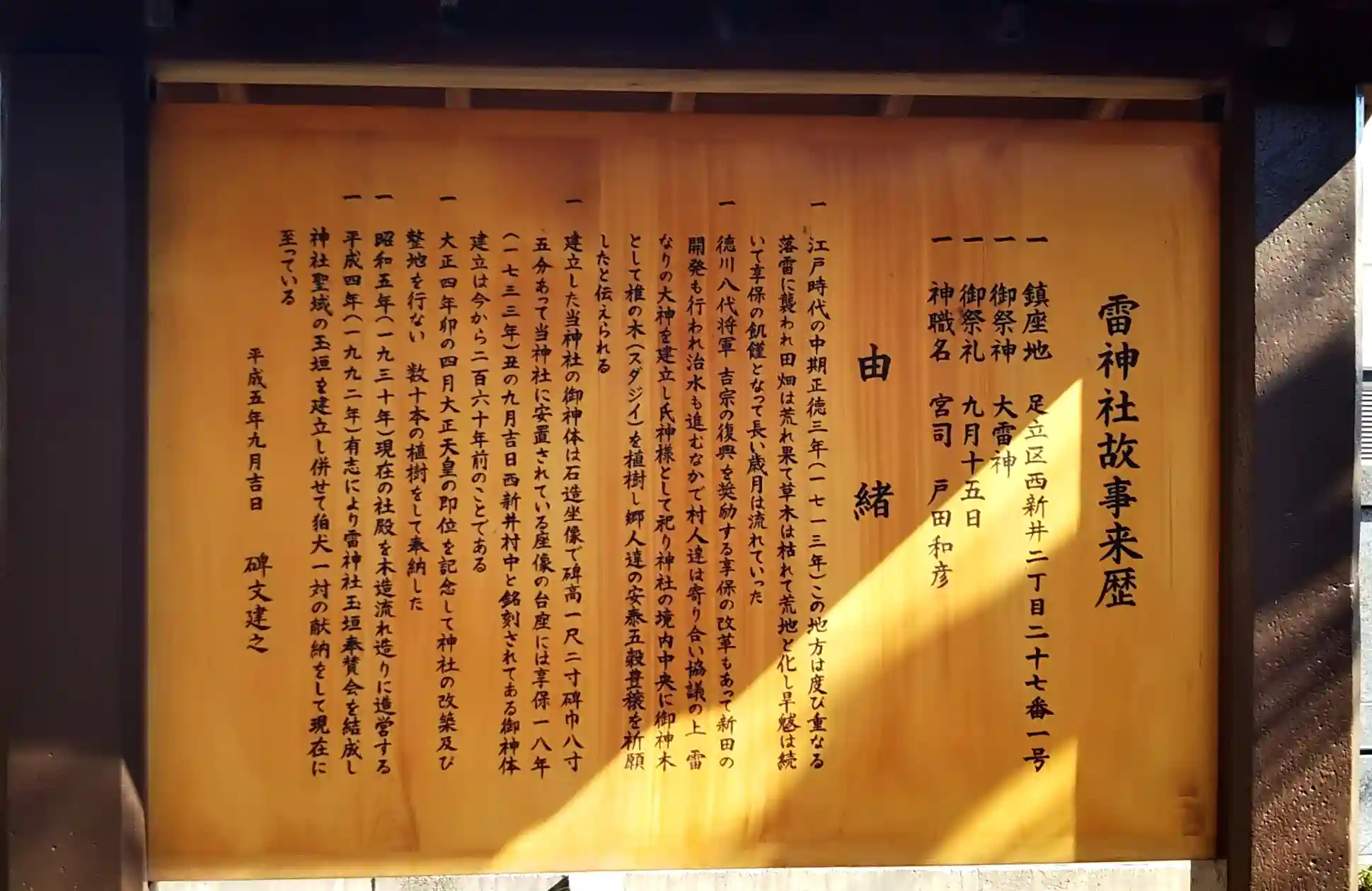 昔、村が荒廃しないことを願いこの土地の守り神として大雷神(おおいかづちのかみ)を祀り、境内の中央に御神木を植えたのがはじまりだそうです。