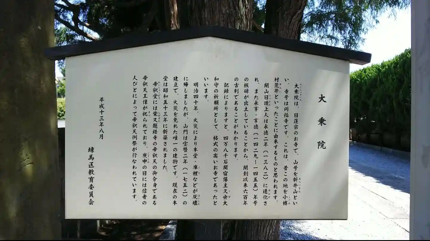 新井山大乗院円福寺。日蓮宗の寺院です。創建年代は不詳ですが、日讃上人(永徳2年/1382年寂)により創建されたと云われています。明治40年(1907年)の火災により本堂・庫裡などを焼失しましたが、宝暦2年(1752年)建立の山門だけは被害を免れています。保谷駅より徒歩で約15分。駐車場もあります。