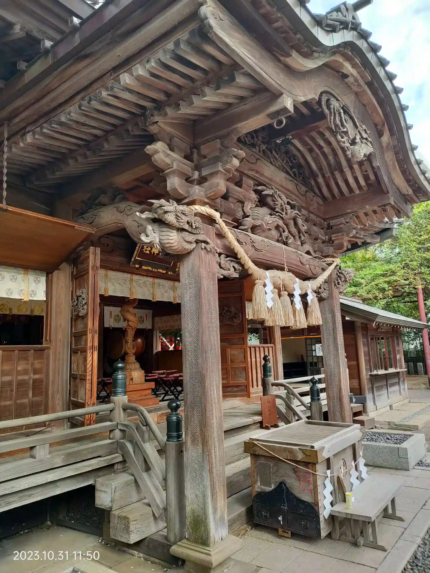 地元で永く愛されてる神社。この日は拝殿の扉が開いてて内部を少し見ることが出来ました。軒下の彫刻が奥行きあって格好いいです。