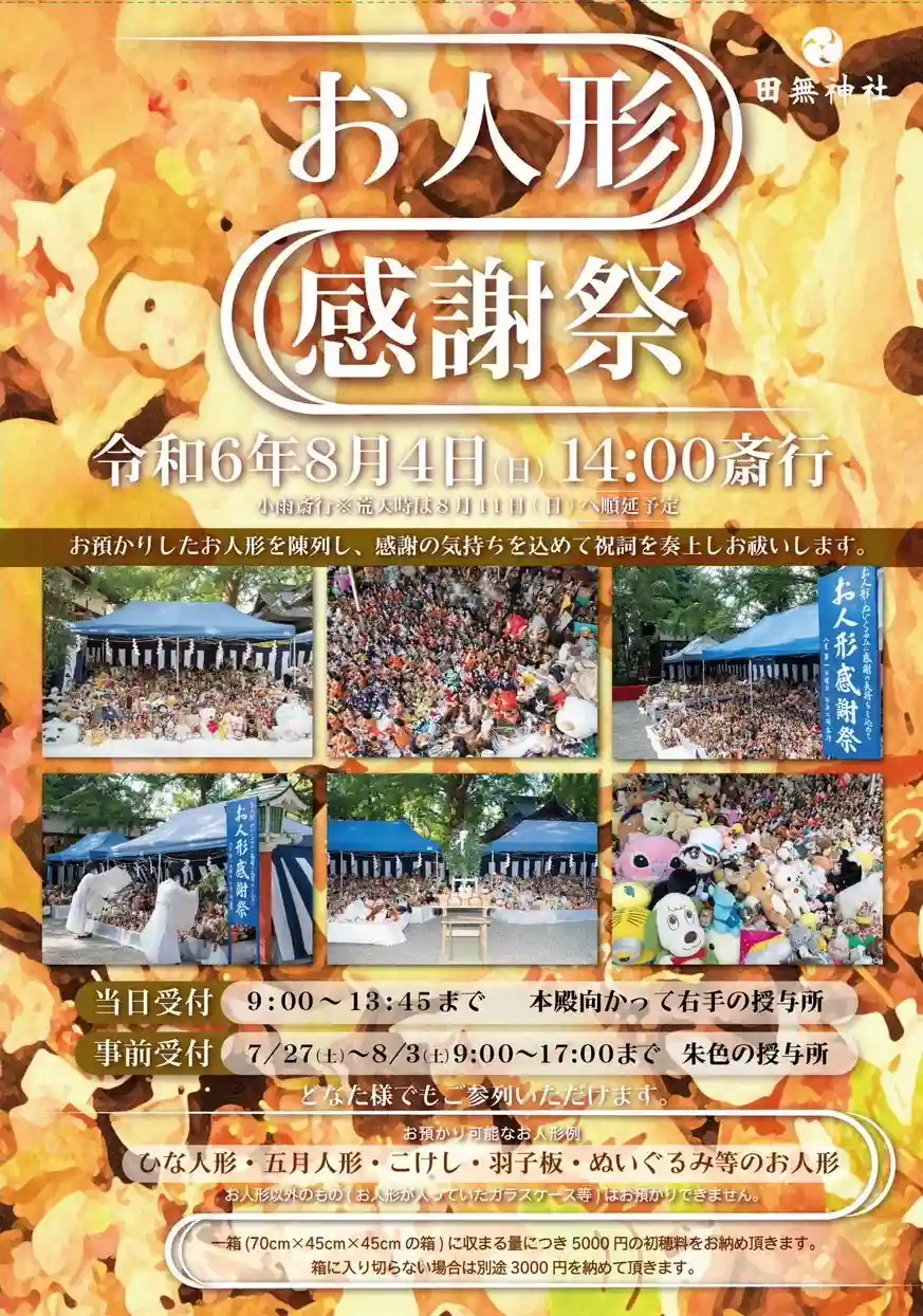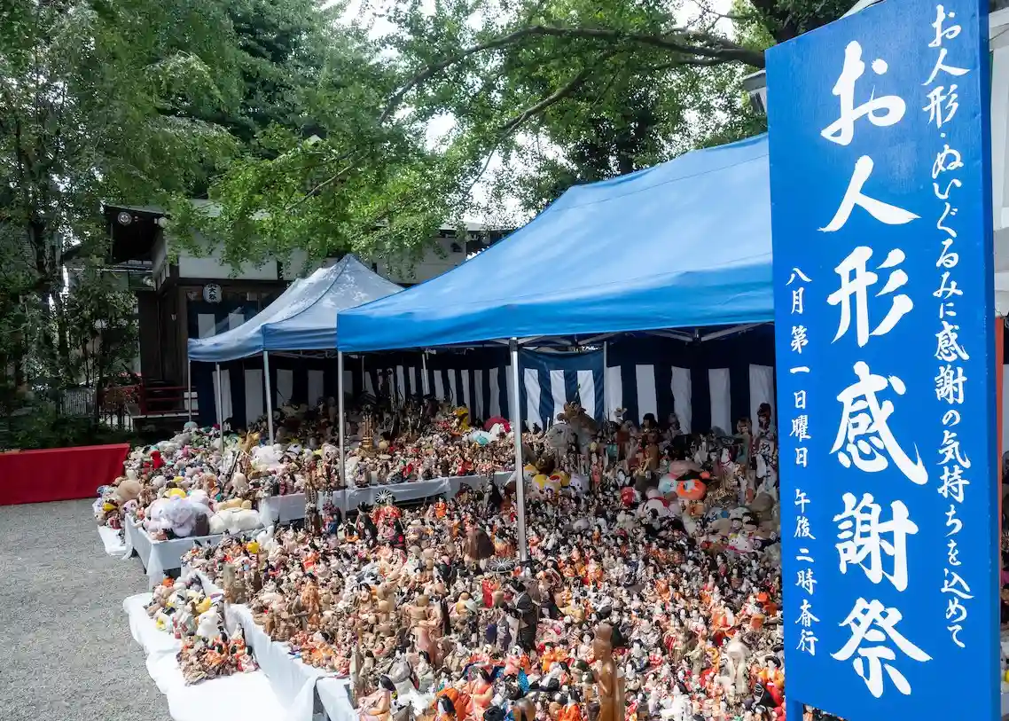 日本では、古来よりお子様の成長を祈り、3月にはおひな様、5月にはよろい・かぶとや五月人形を飾ってきました。最近では、お子様が大きくなり、また、住宅事情等により、以前のようにお飾りすることが難しくなったとのお声を聞くことがあります。愛着はあるけれど古くなってしまったぬいぐるみをお持ちの方もいます。お人形への愛着や、お顔のある人形には魂が宿るという古くからの考え方によって、そのままゴミとして処分することに抵抗を感じている方が多くいらっしゃいます。そこで、田無神社ではお預かりしたお人形を並べ、祝詞を奏上してお人形に感謝の気持ちを捧げる「お人形感謝祭」を年一回8月の第1日曜日に斉行しています。お預かりしたお人形は「お人形感謝祭」の斉行後、神社で責任を持ってお焚き上げ等、適宜の方法により処分いたします。