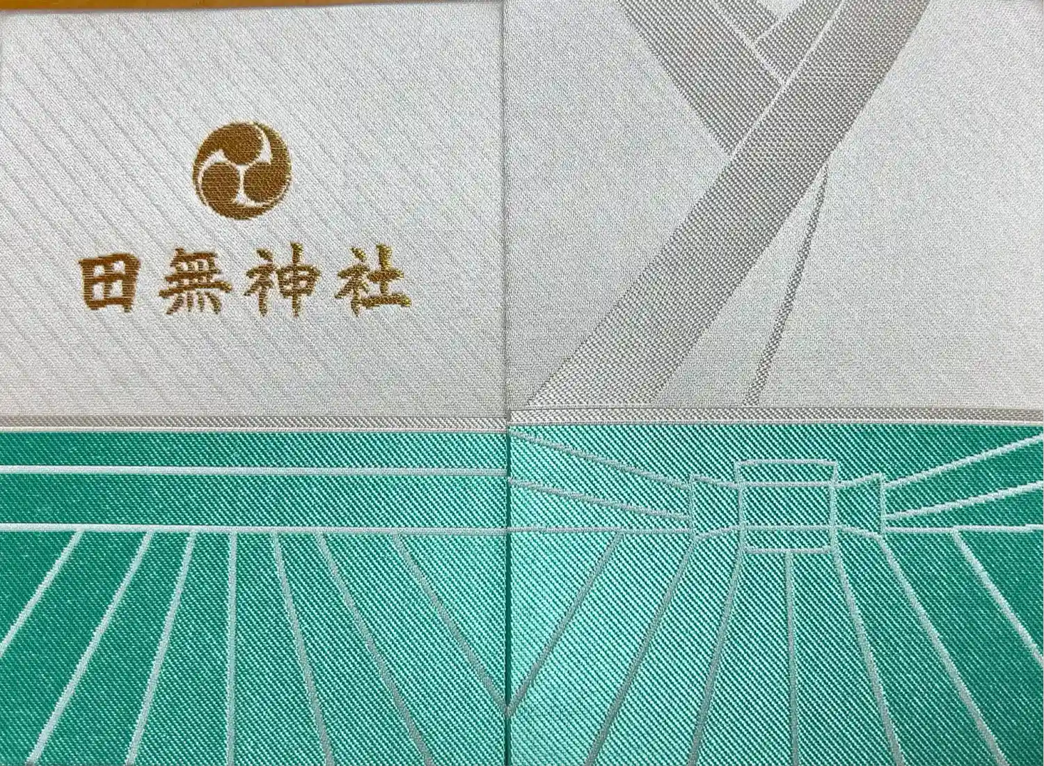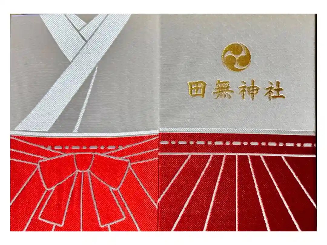 地の上部に桜の花が散らばり、龍神様とご神木であるイチョウのイラスト、真ん中に田無神社の文字と印が入っています。