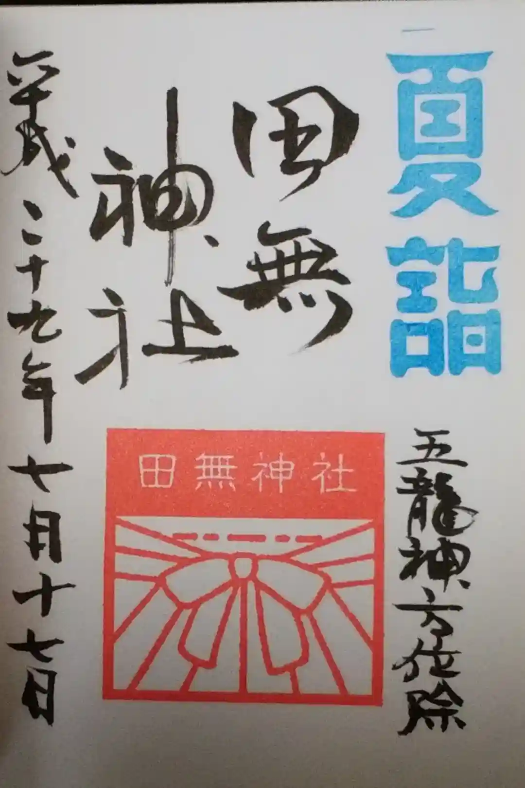 右下になつもうで、真ん中に田無神社と書かれ、龍の印、田無神社の印、左下に田無神社社務所之印が押されています。