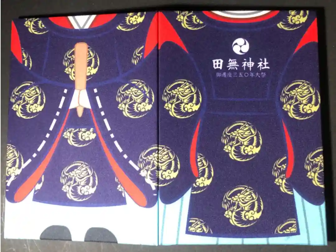 背面の真ん中に三つ巴紋と田無神社、御遷座三五〇年大祭の文字が入っています。
