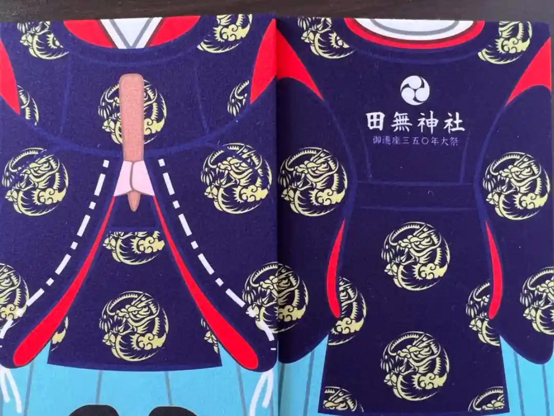 背面の真ん中に三つ巴紋と田無神社の文字が入っています。