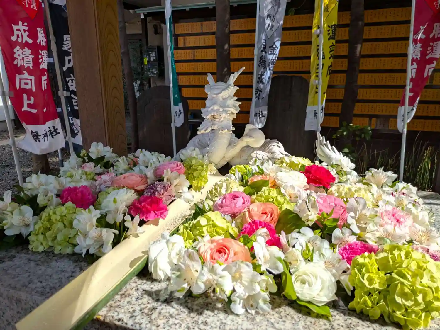 花に囲まれた龍の手水舎。