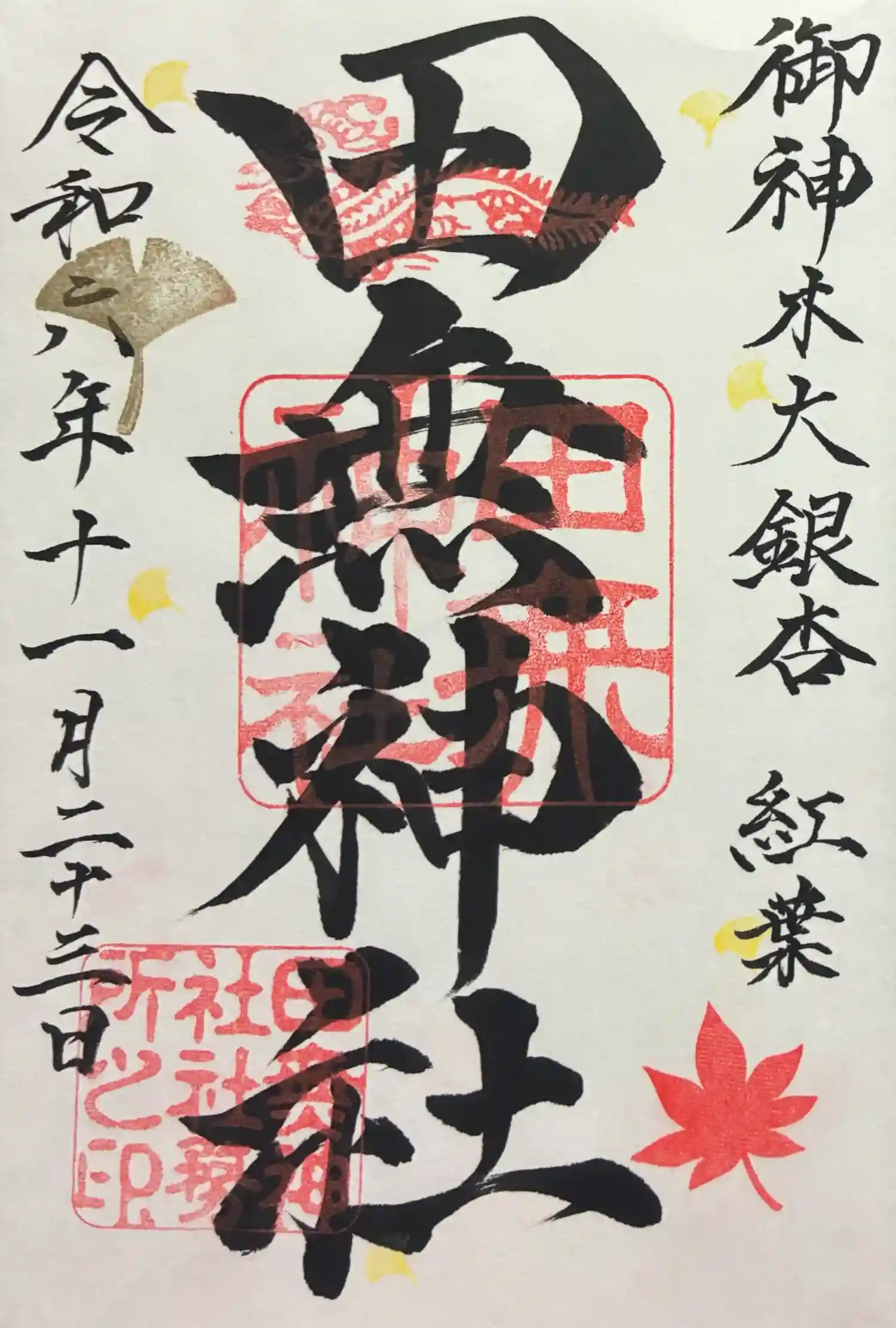 御神木の銀杏が見事に色づいていて、それにどっしりとしていて、すごく立派で、とても感動しました。ほん…