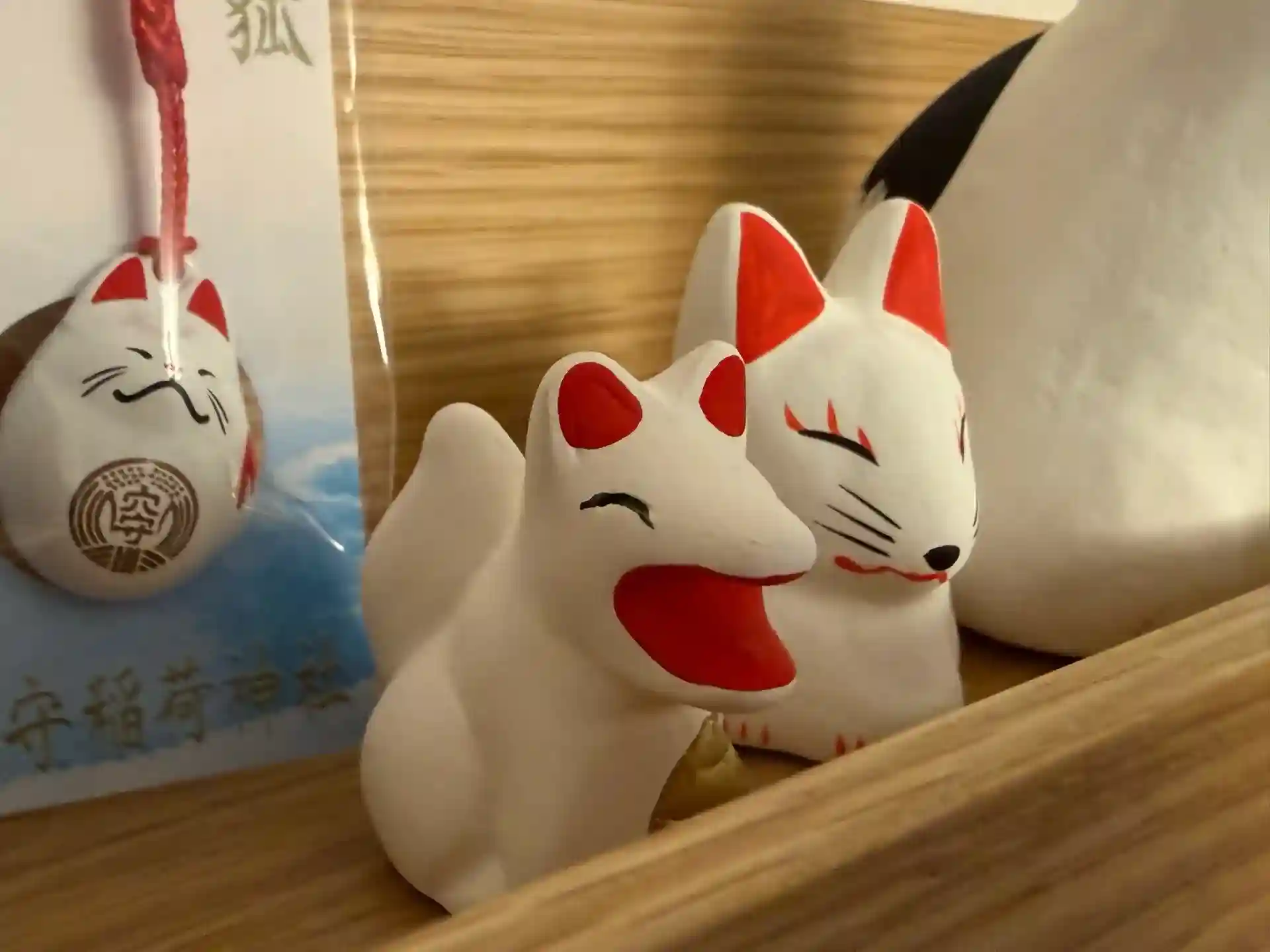きつねみくじを引いたら大吉を頂いたので持って帰ってきて置物にもパワーを分けていただいて部屋に飾りました☺️(手前の元気なやつ!)