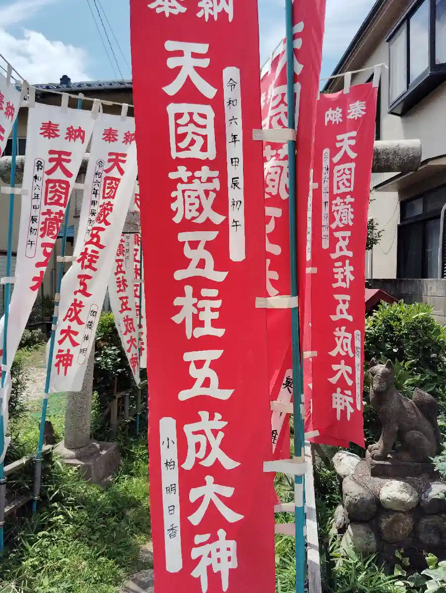 解脱会中野支部初代支部長大塚スイ氏の先祖槙屋平兵衛が、文政六年(1823)京都伏見稲荷より御分霊をお祀りしたのがはじまりだそうで、解脱会の創設者岡野聖憲氏が当地を訪れた際、広く人々にその御神徳を分つべきであると感得したことで五柱の神を合わせ「五柱五成神社」を奉斎されたとのこと