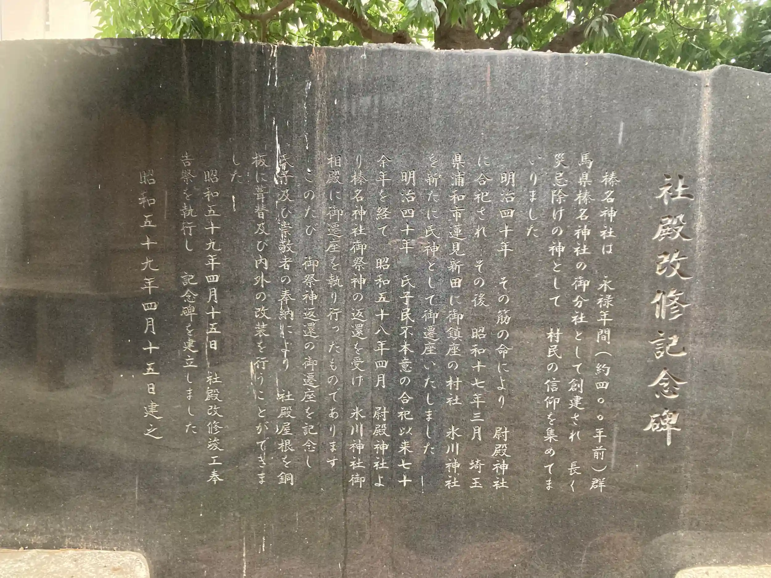 御由緒ー元々は榛名神社(大権現)が祀られていたが、国の政策により明治四十年(1907)に尉殿神社(旧上保谷村の総鎮守)に合祀されて、不在となった地に、氏子の要望により、浦和市蓮見新田の村社であった氷川神社を御遷座しました。後に昭和五十八年(1983)に榛名神社も尉殿神社より分祀されてきました。