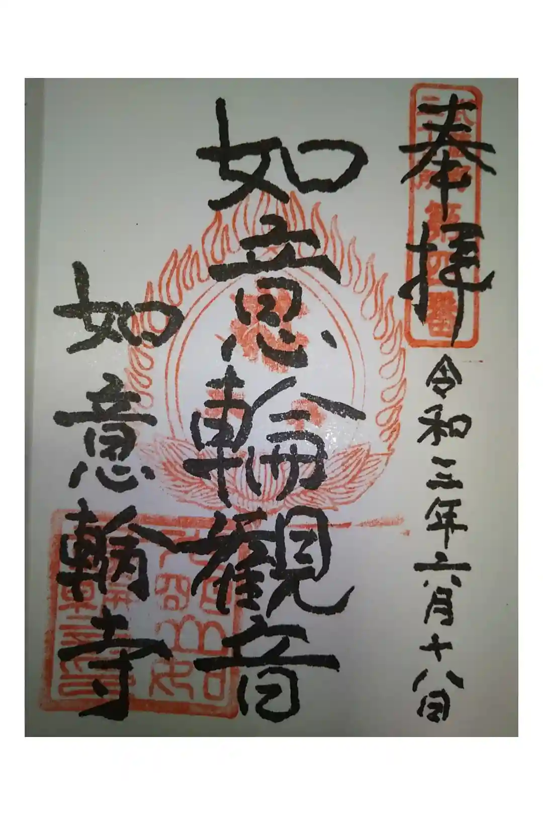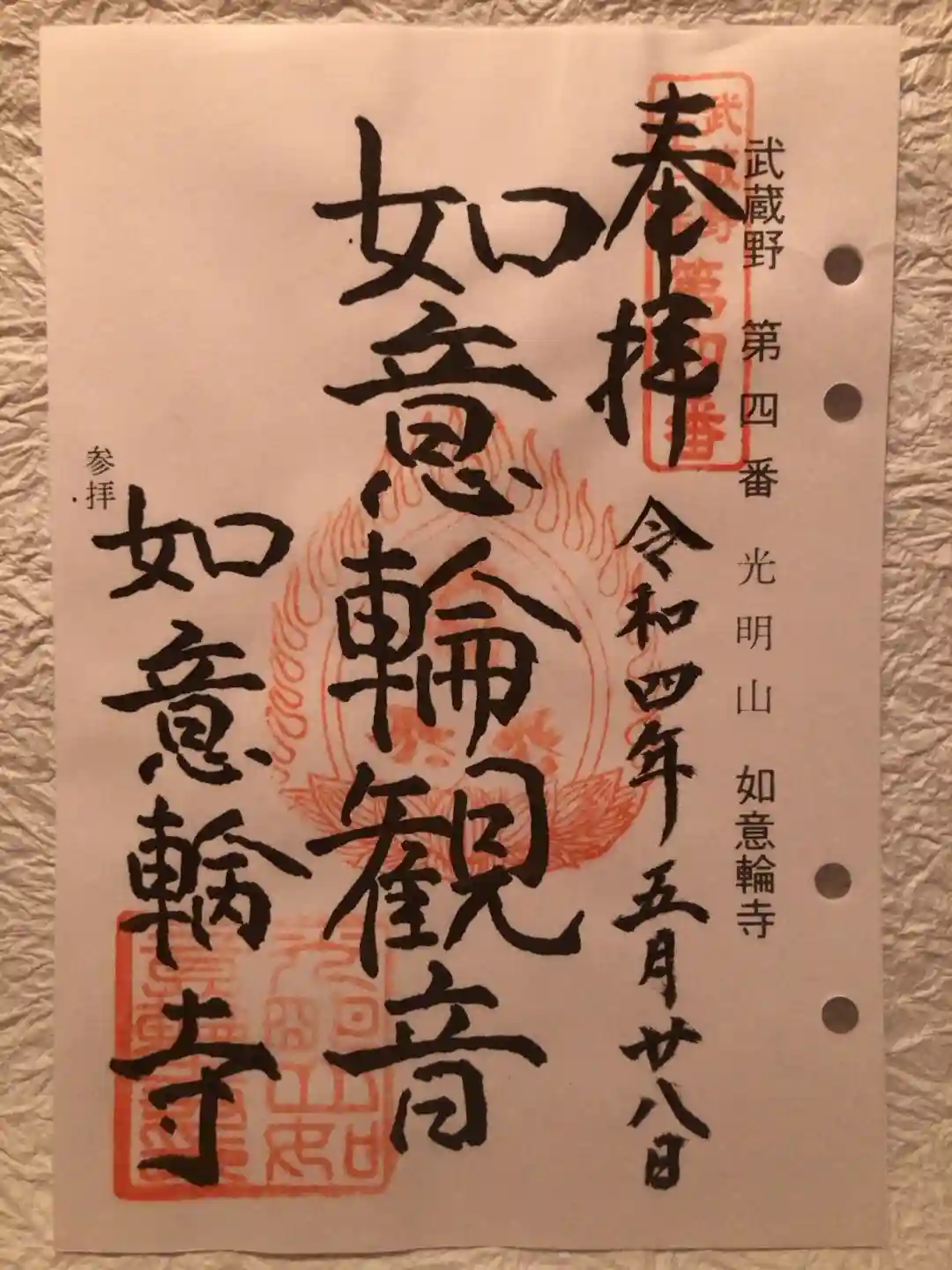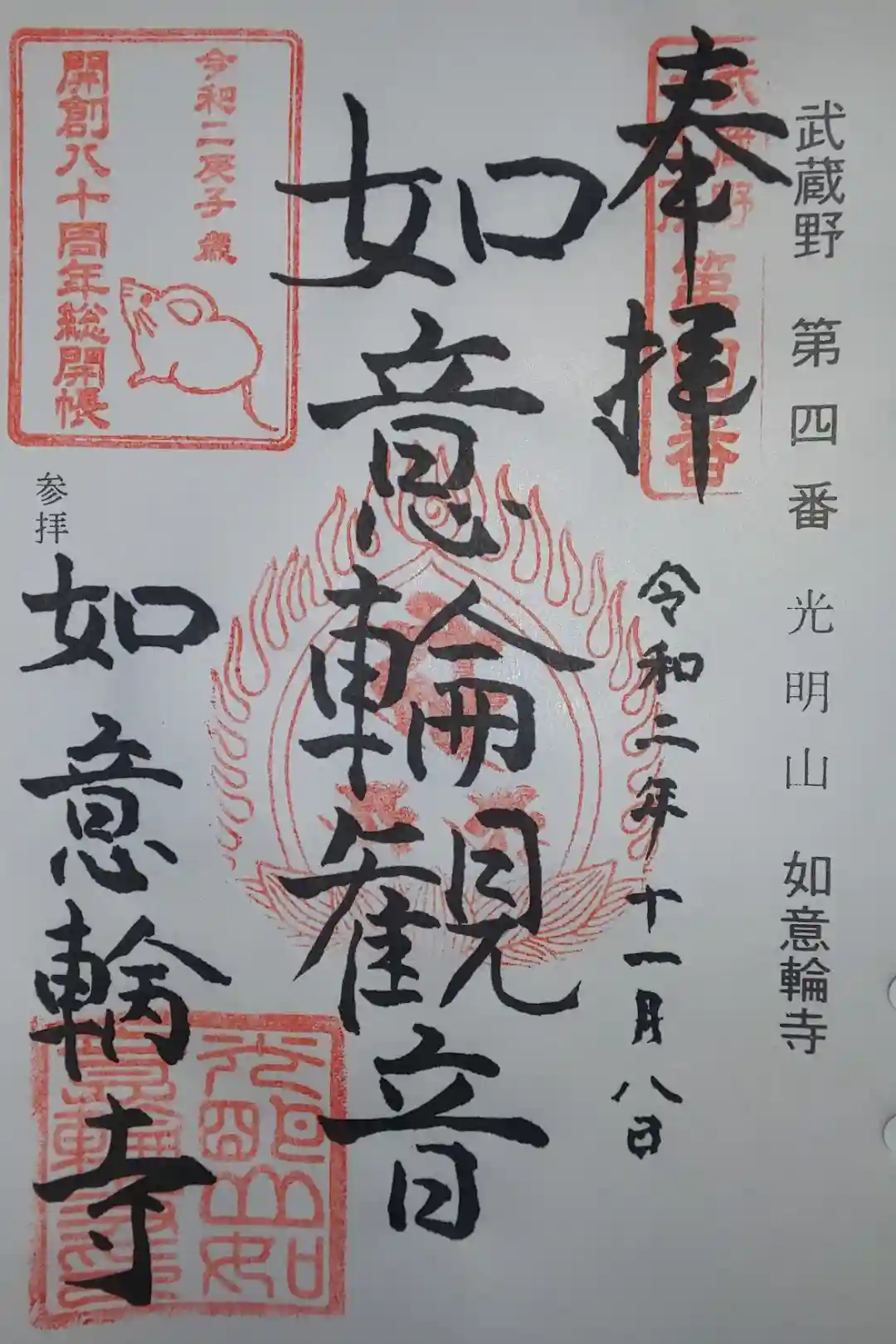 住宅地に一際目立つ朱色の山門の光明山如意輪寺へ。武蔵野三十三観音霊場第4番です。丁寧に対応していた…