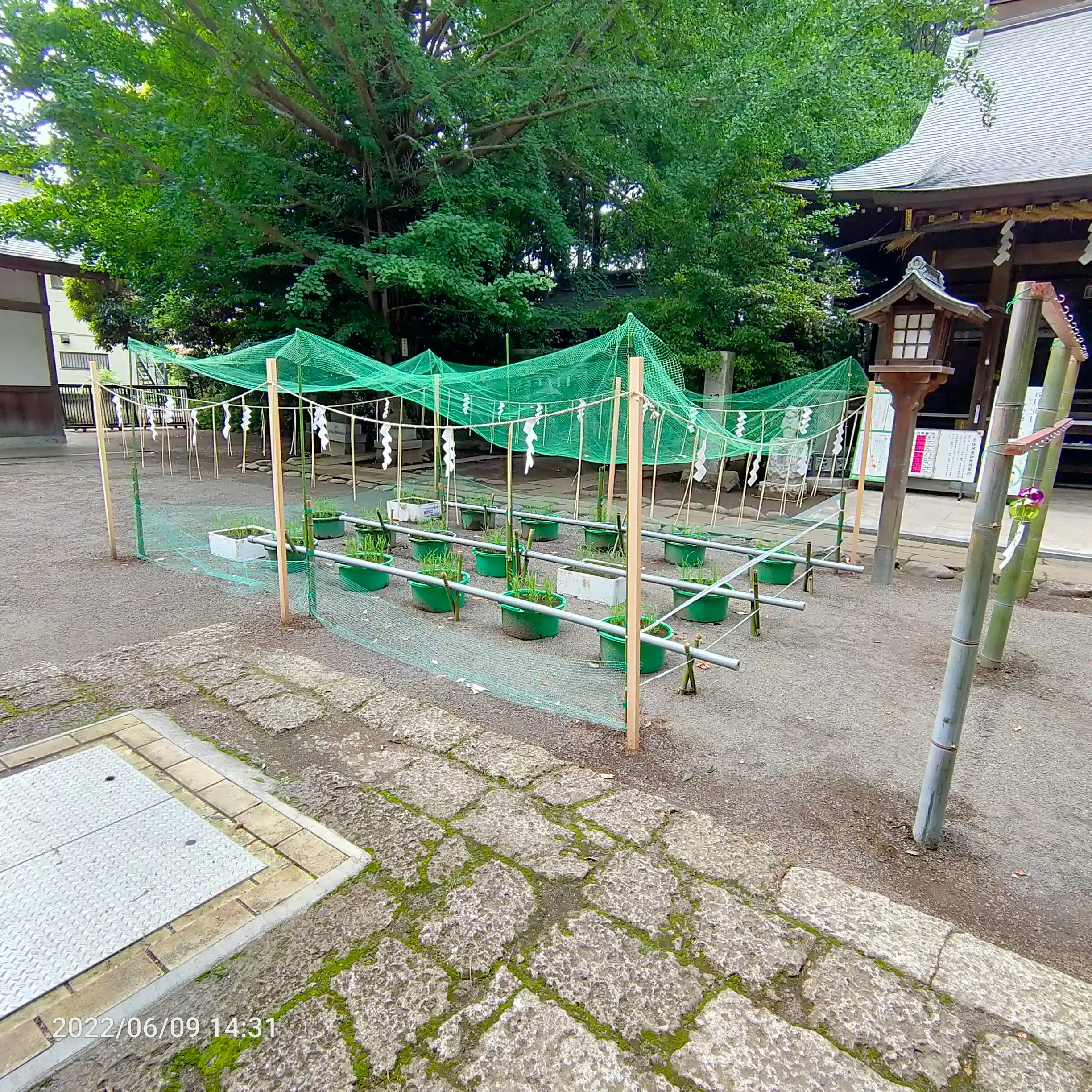 新嘗祭で使用する何かを育てているそうです。傍らには風鈴がたくさんあり、子供たちが願い事を書いた短冊もついてました。
