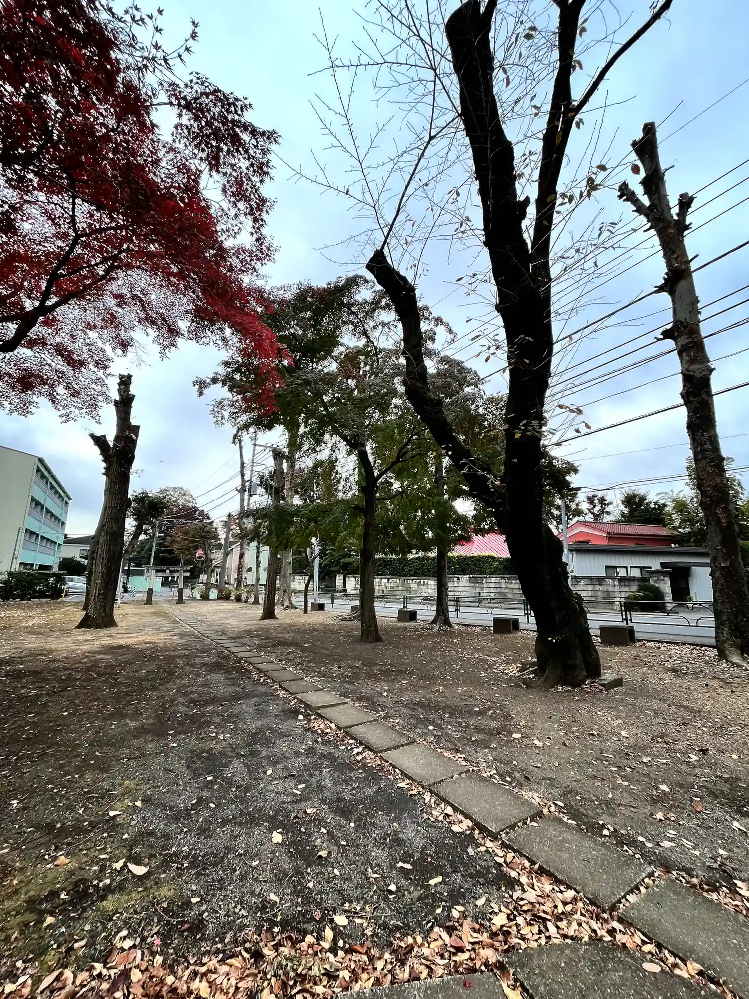 境内全景。境内の周囲に植栽などはなく、左側を走る立川通りからもよく見渡せる。