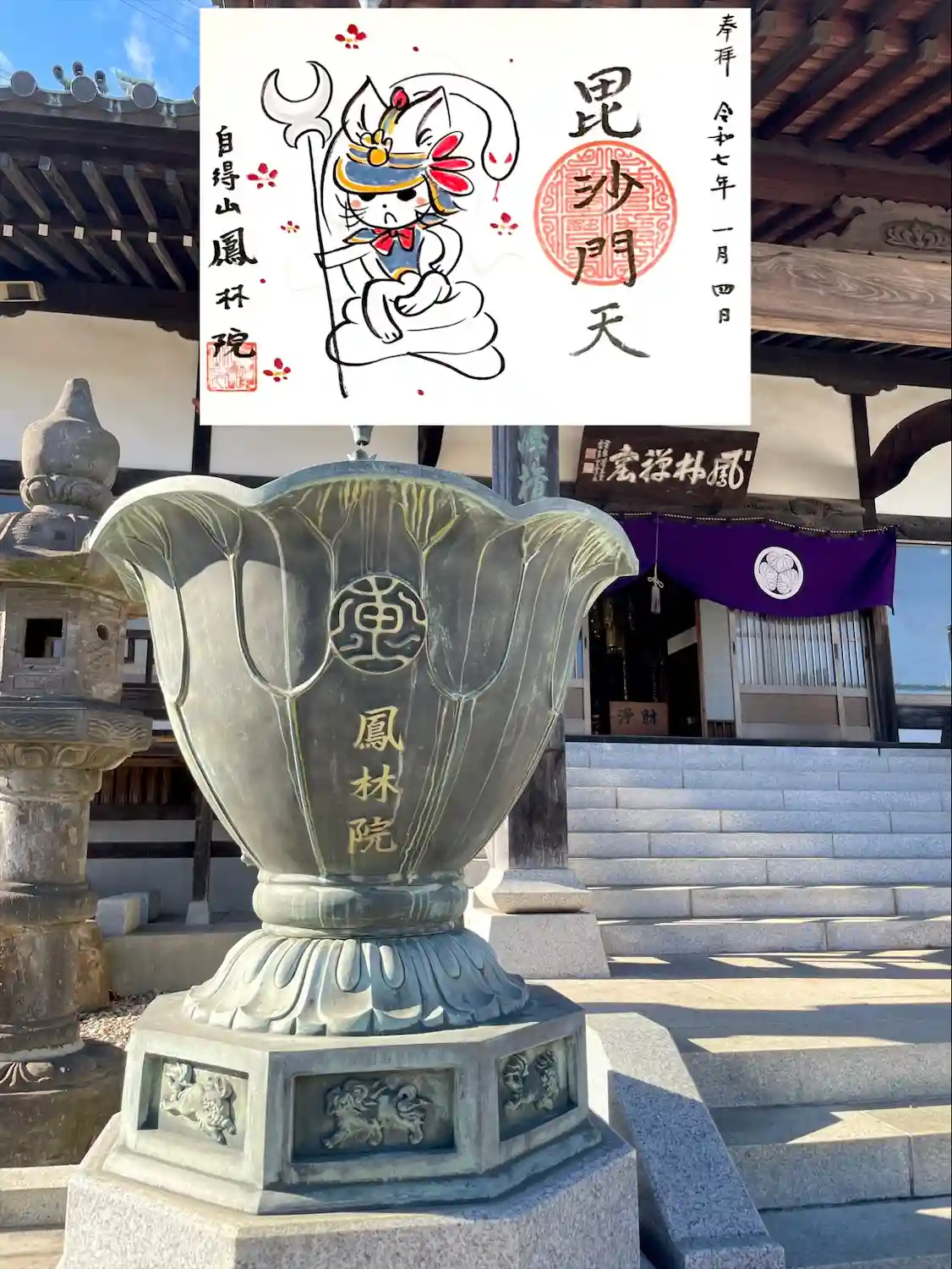 本堂とイラスト"毘沙門天御朱印"