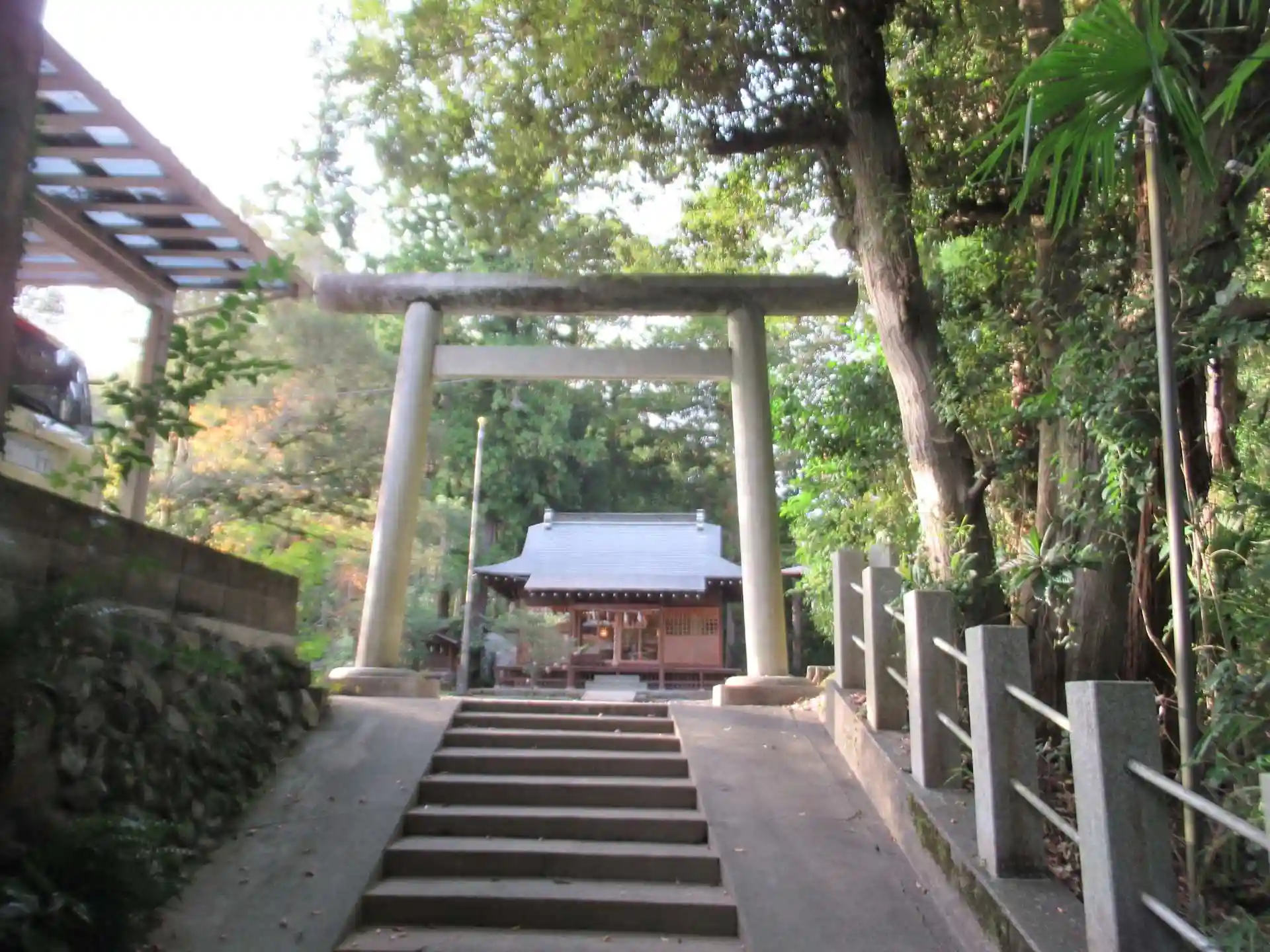林の中の舗装されていない参道から、コンクリート舗装の階段を上ると二の鳥居があります。