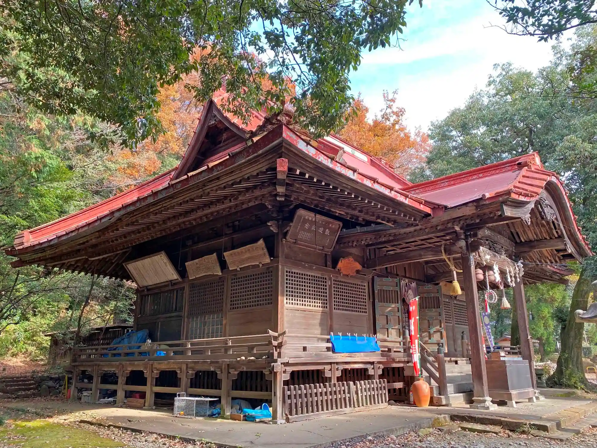 当社は、JR八高線・箱根ヶ崎駅の東南東2kmの狭山丘陵の南西麓にある。青梅街道(都道5号線)から北に数百m入った住宅街外れにある。長い参道を進むと、後ろに小山を控えた小高い場所に社殿がある。大きな社殿は真っ赤なトタン葺の屋根にいかにも古そうな躯体で時の長さを感じる。一見古そうだが、何気にバリアフリー通路が設置されていたりと、現在でも信仰が篤いことが分かる。