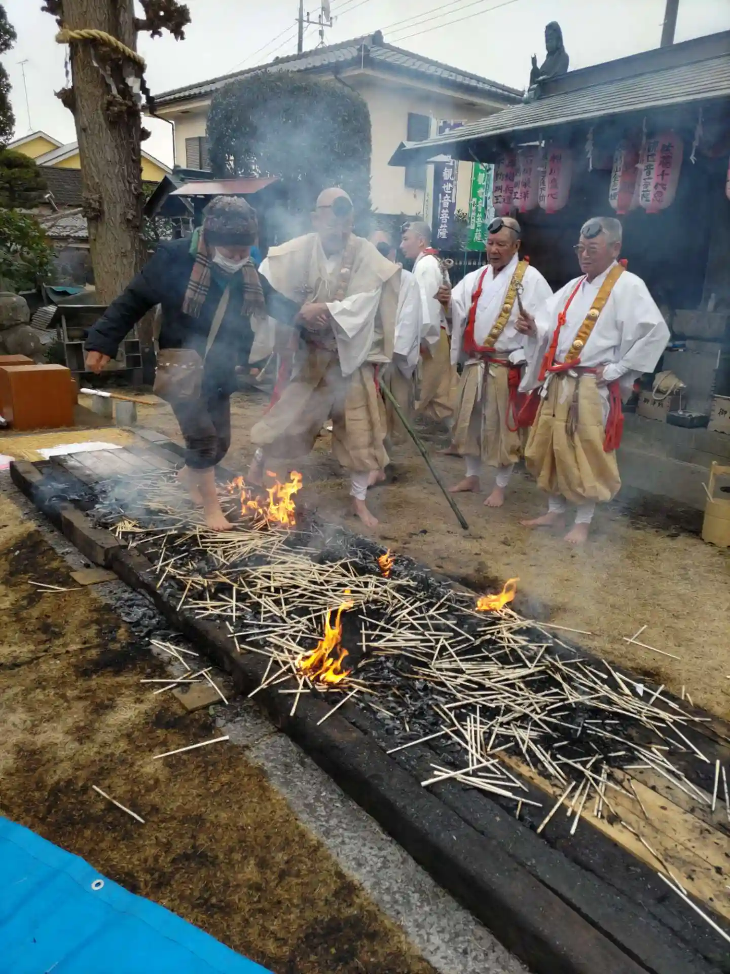 火渡り儀式。山伏姿の修行者。