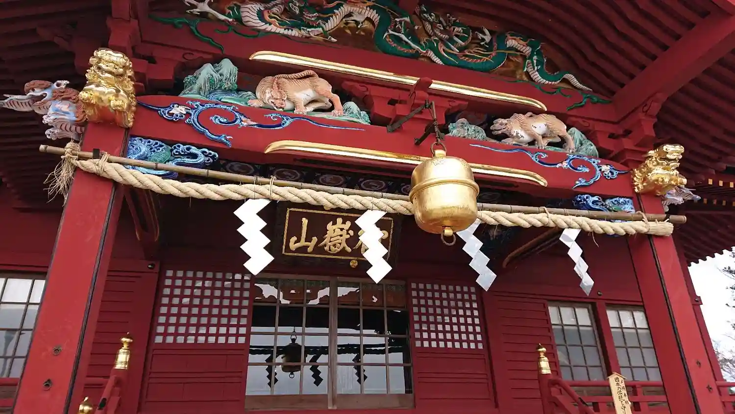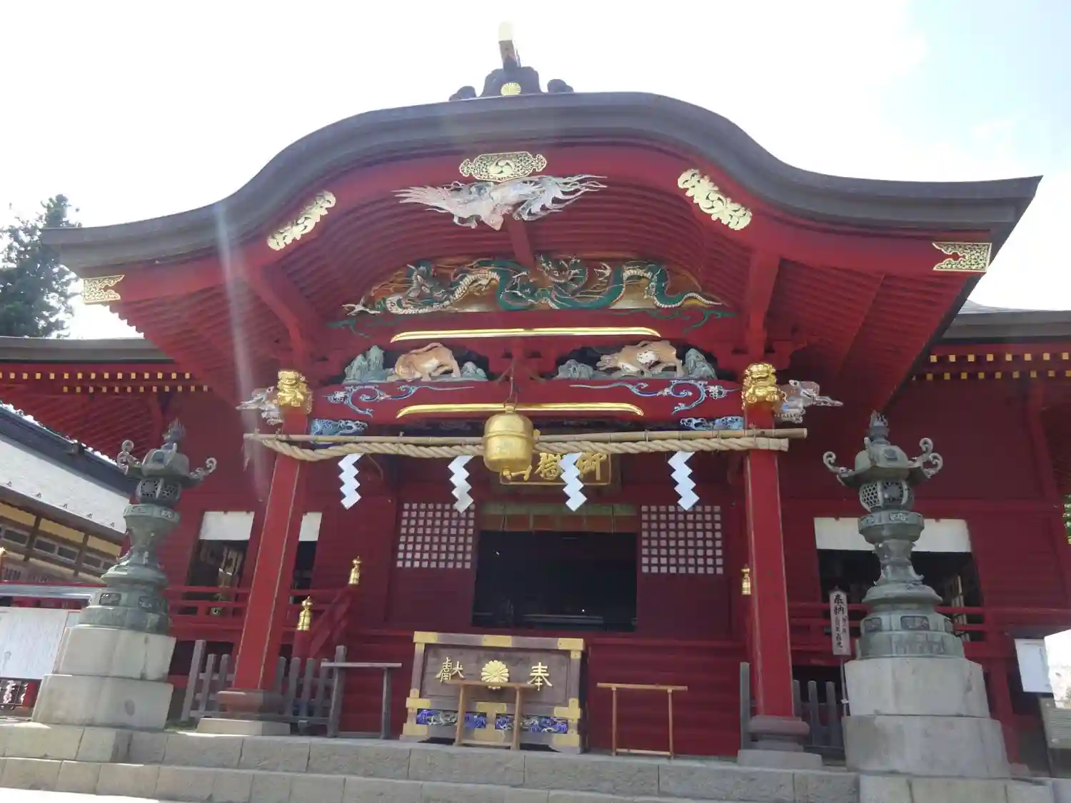 朱塗りの建物と唐破風向拝の極彩色の彫刻が色鮮やかな<拝殿>。五間社入母屋造。