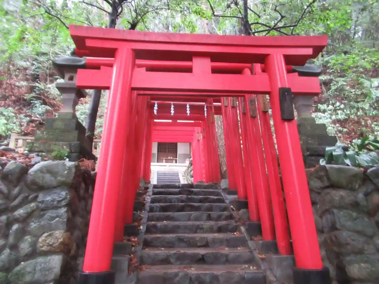 踏切を渡ってすぐ、意外と急な石段の先に赤い鳥居が見えます。石段は段差がでこぼこしていて手すりに助けられるような箇所もあります。