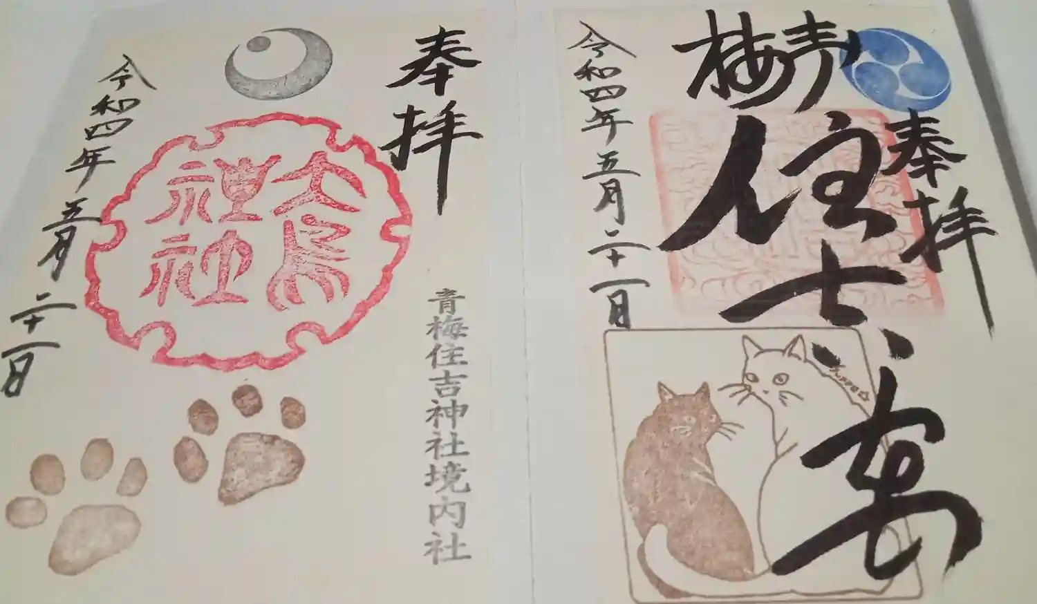 住吉神社の御朱印は摂社の大鳥神社のものと合わせて2種類あります。お祭りやお正月など繁忙期は書置きですが、普段は直書きしていただけるようです。
