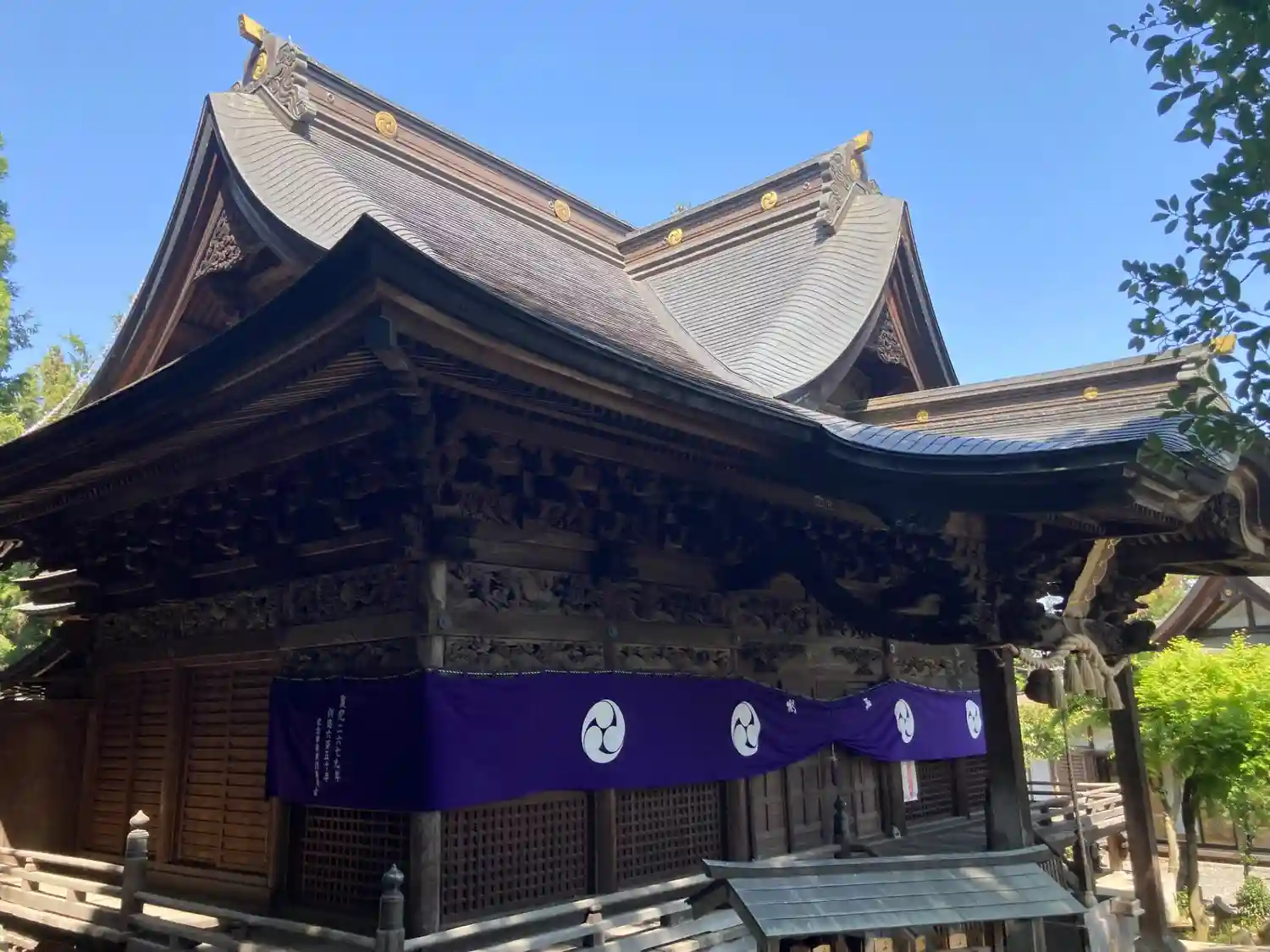 慶長十八年(1613)落雷により幣殿、拝殿が焼失し、宝物や記録も失われました。ただ本殿は千木、梁などわずかに焼損しただけで残ったそうです。正徳六年(1716)社殿の建造、そして文政七年(1824)に現在見られるような幣殿、拝殿として再建されました。