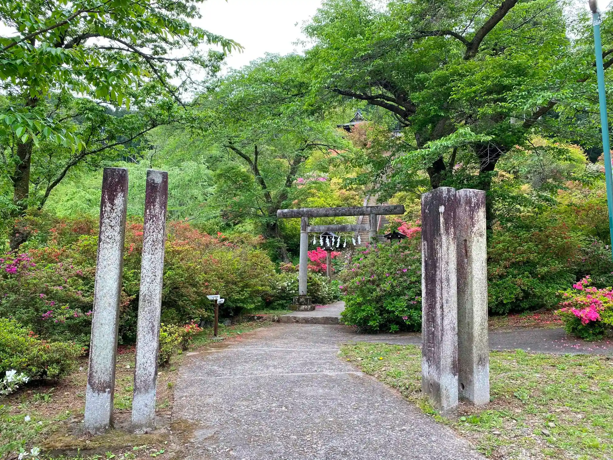 階段途中の満開のツツジの株。青梅市観光協会のHPによると、当社はツツジで有名らしい。これが<じゃらん>で人気神社になっている理由みたい。