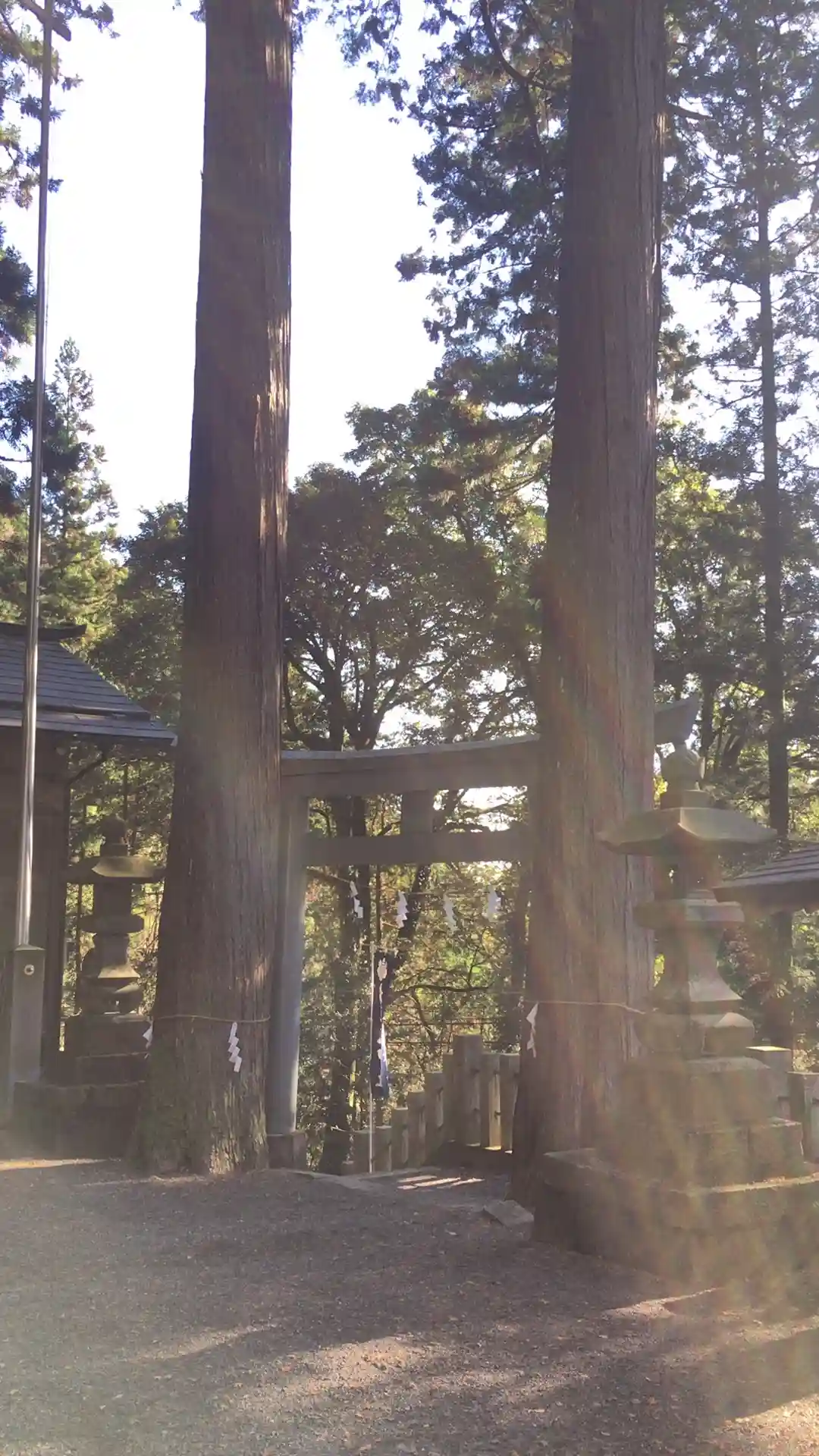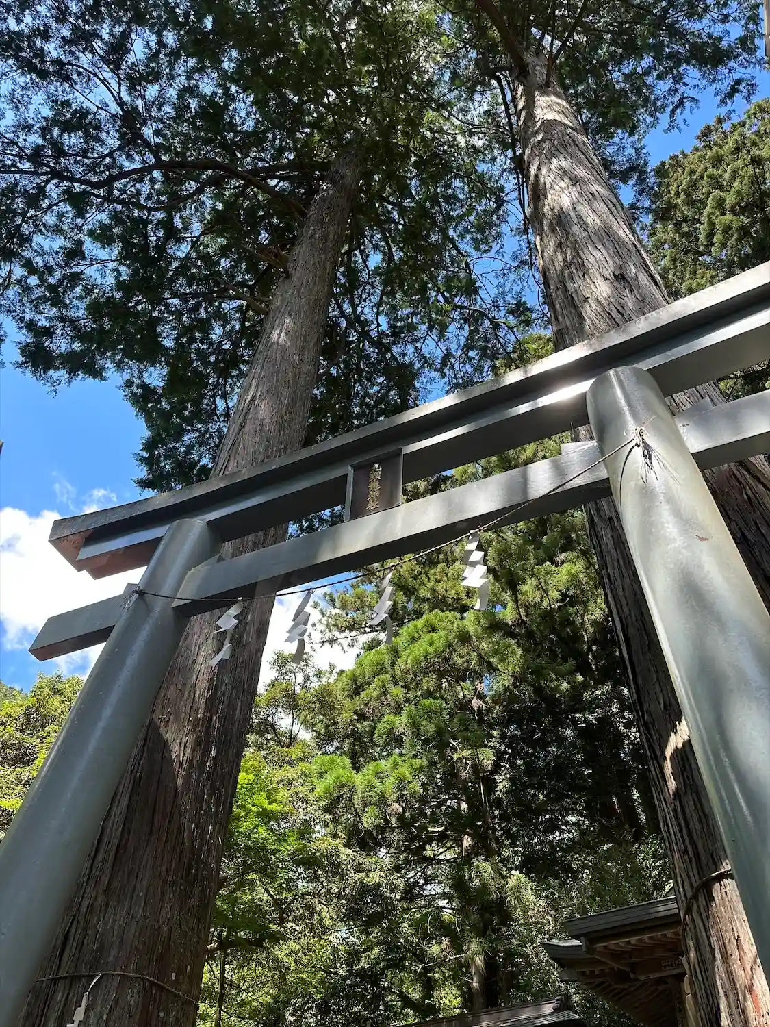 入口の鳥居の両サイドには、杉の巨木がまっすぐ天に向かって伸びている。