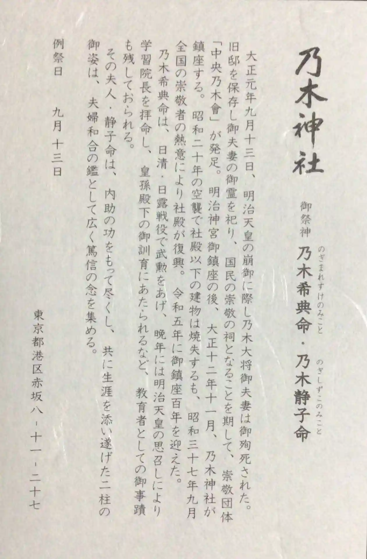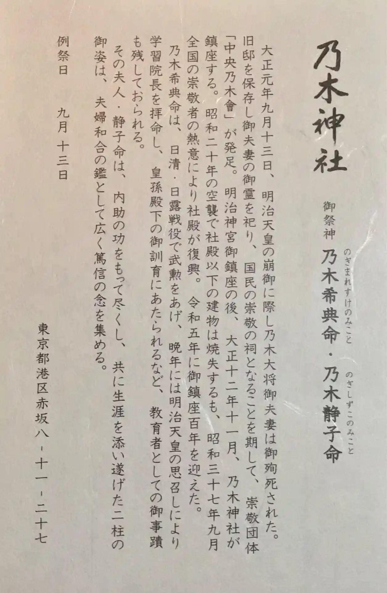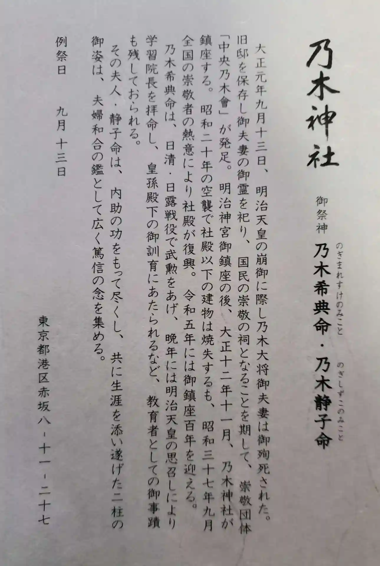 主祭神:乃木希典命 乃木静子命