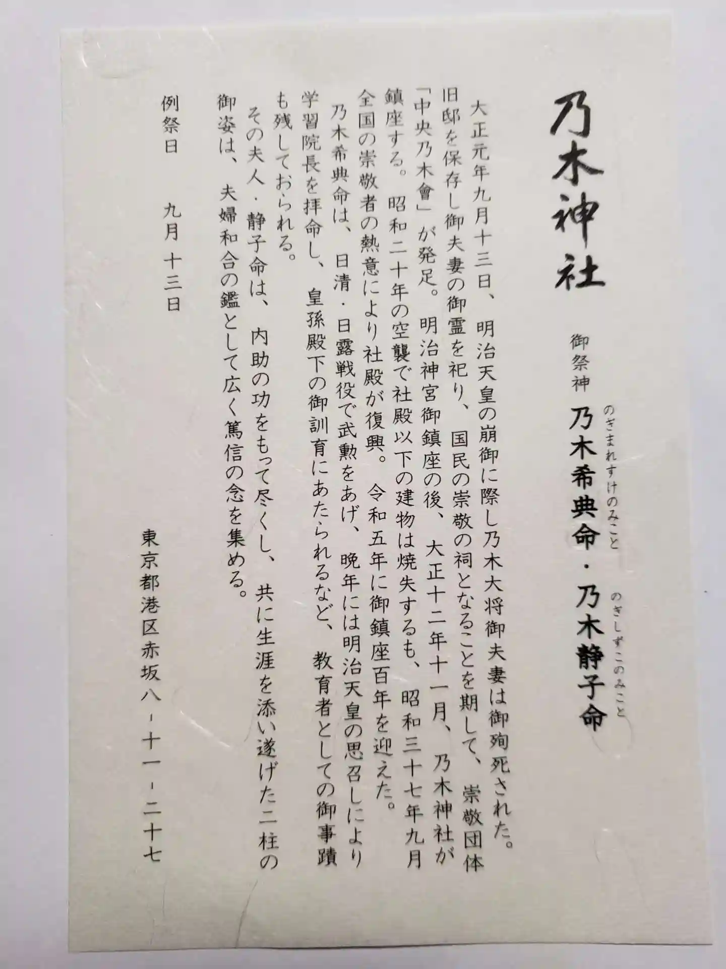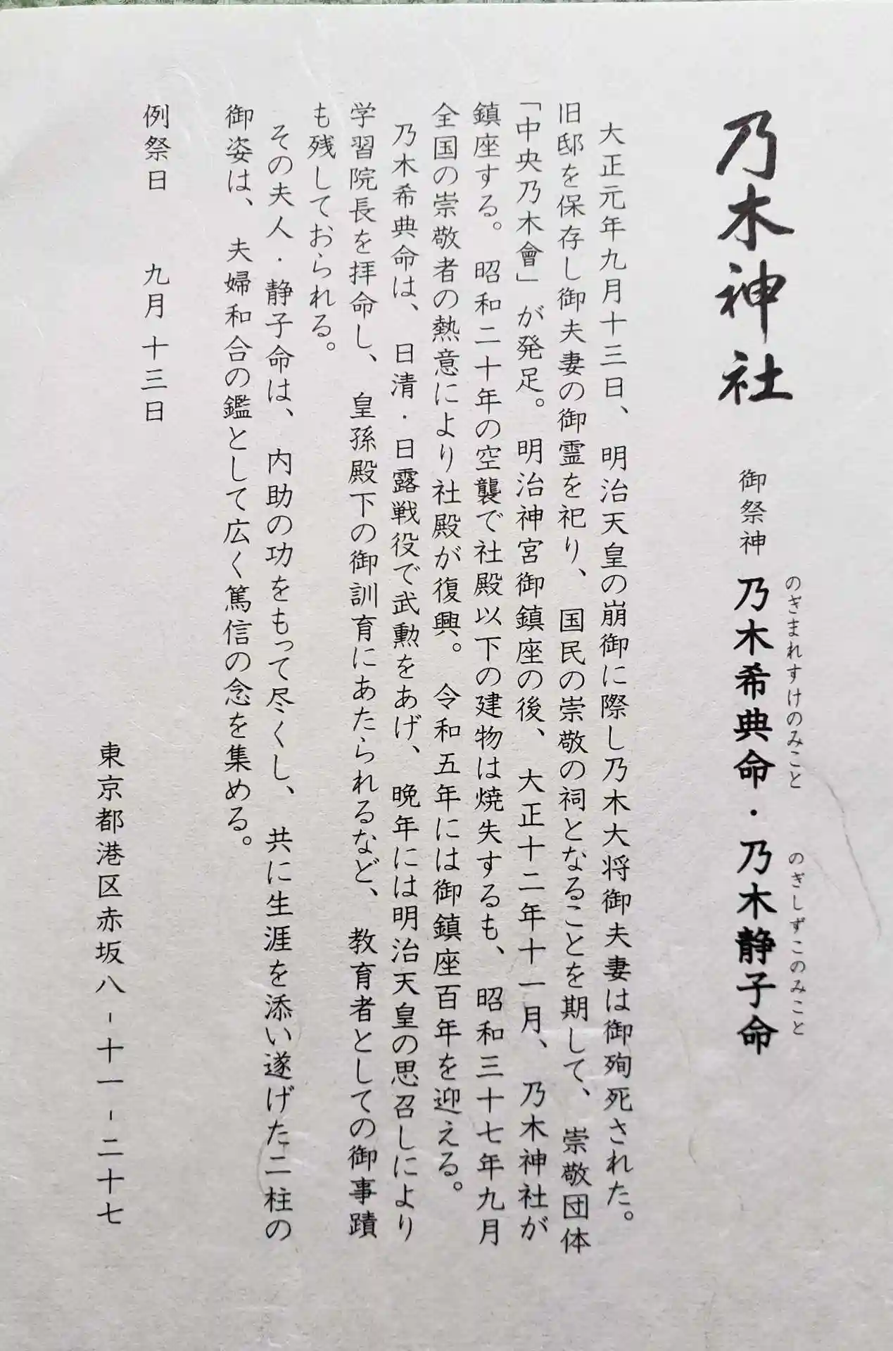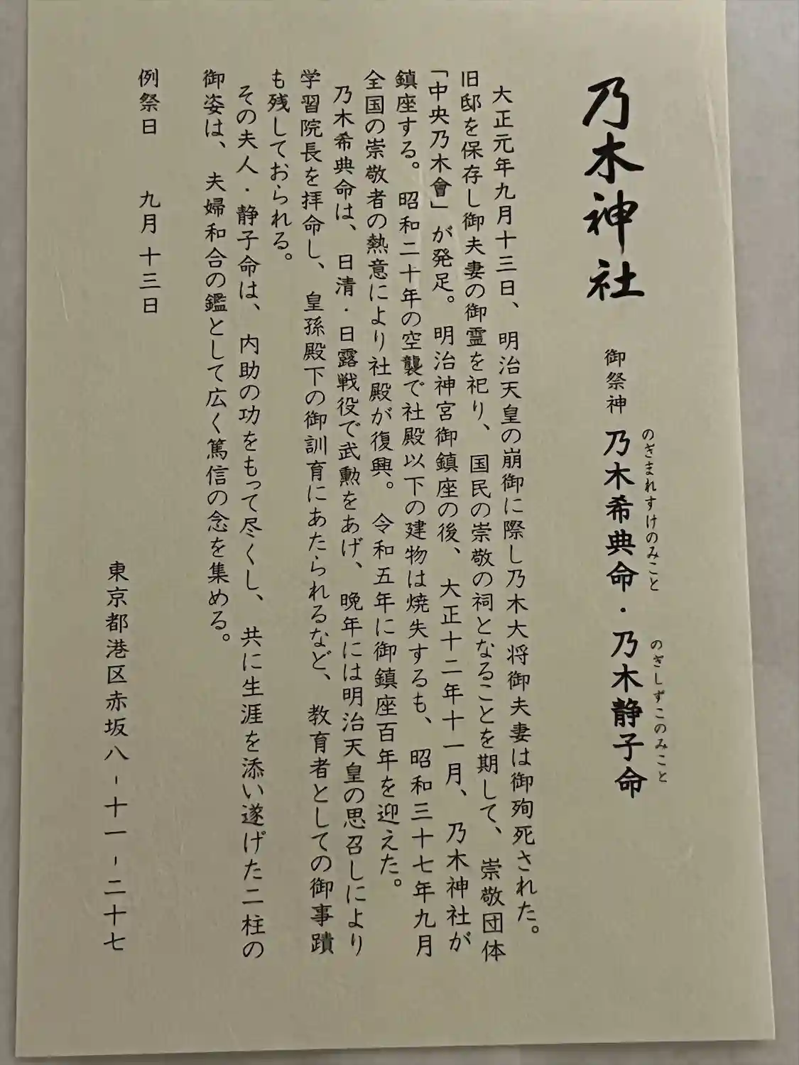 主祭神:乃木希典命 乃木静子命