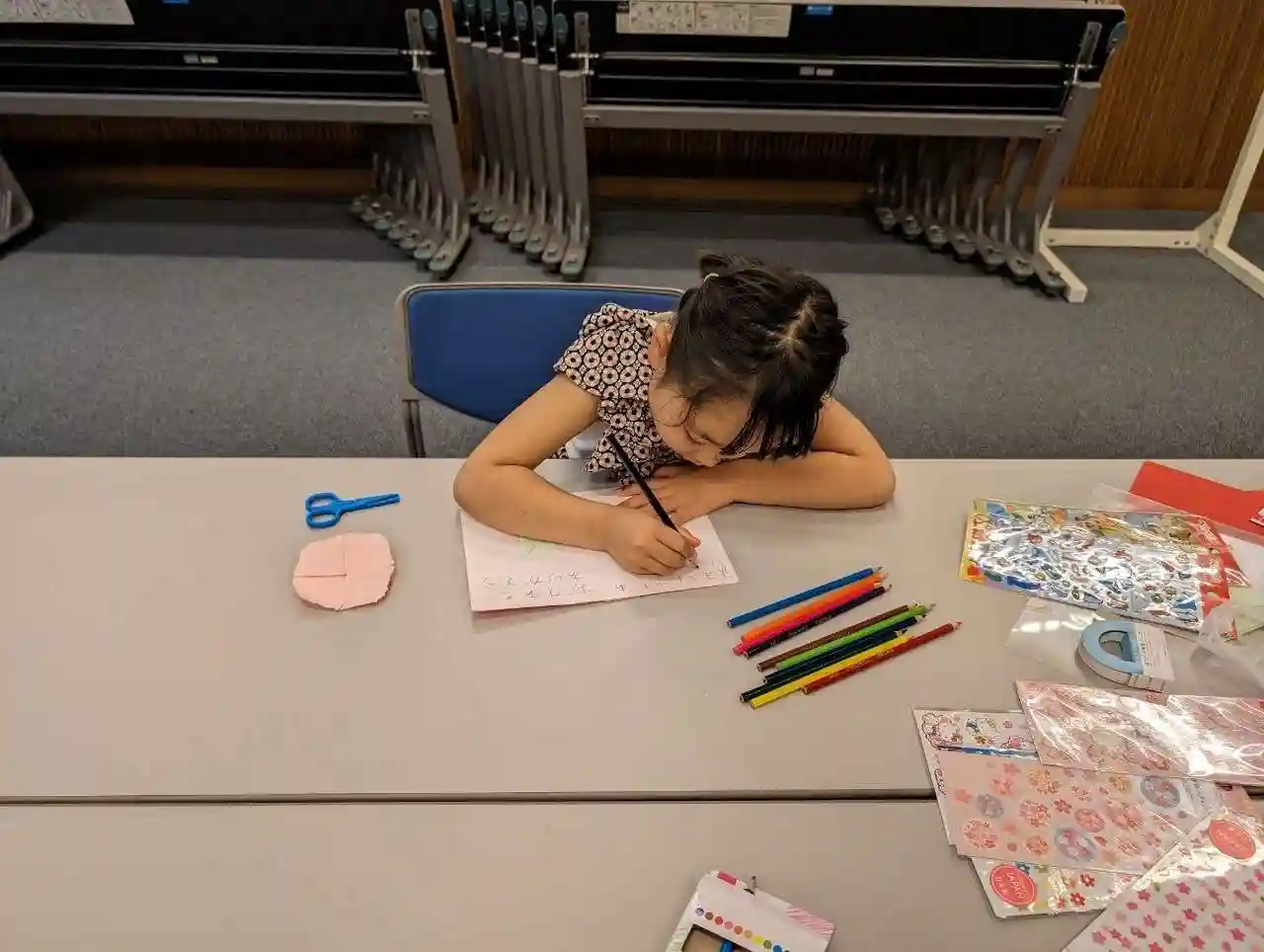 お母さんへのメッセージカードを作成中。