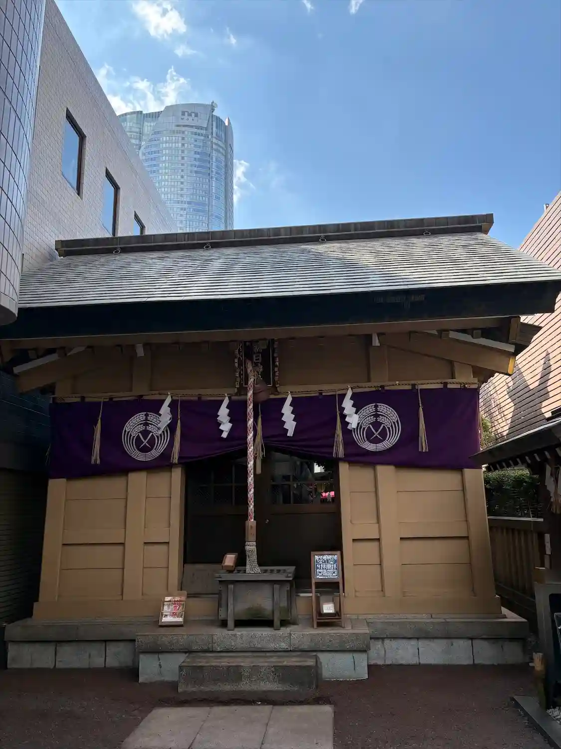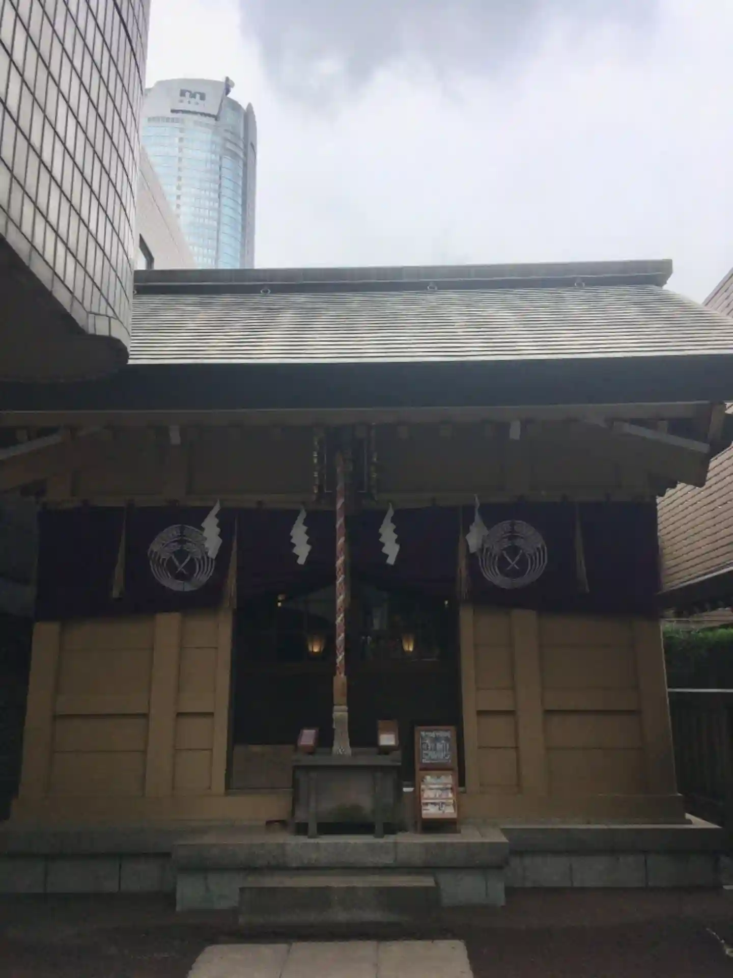 社殿は比較的新しくきれいでした。背後に見える森ビル。やや蒸し暑い曇天。12時半前でこの薄暗さ。