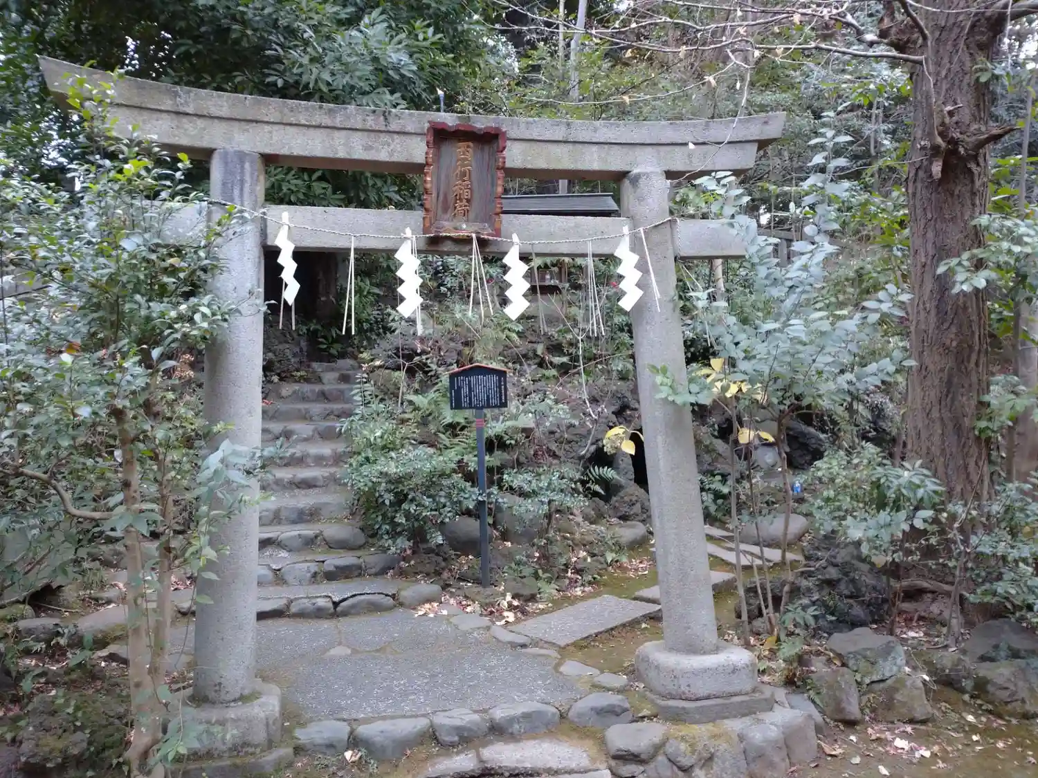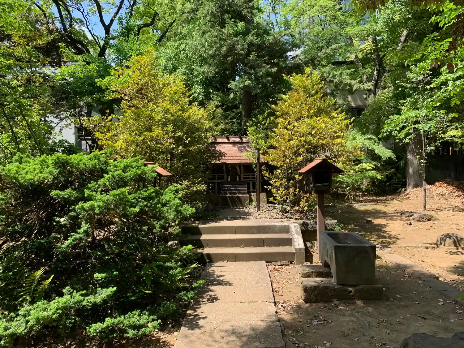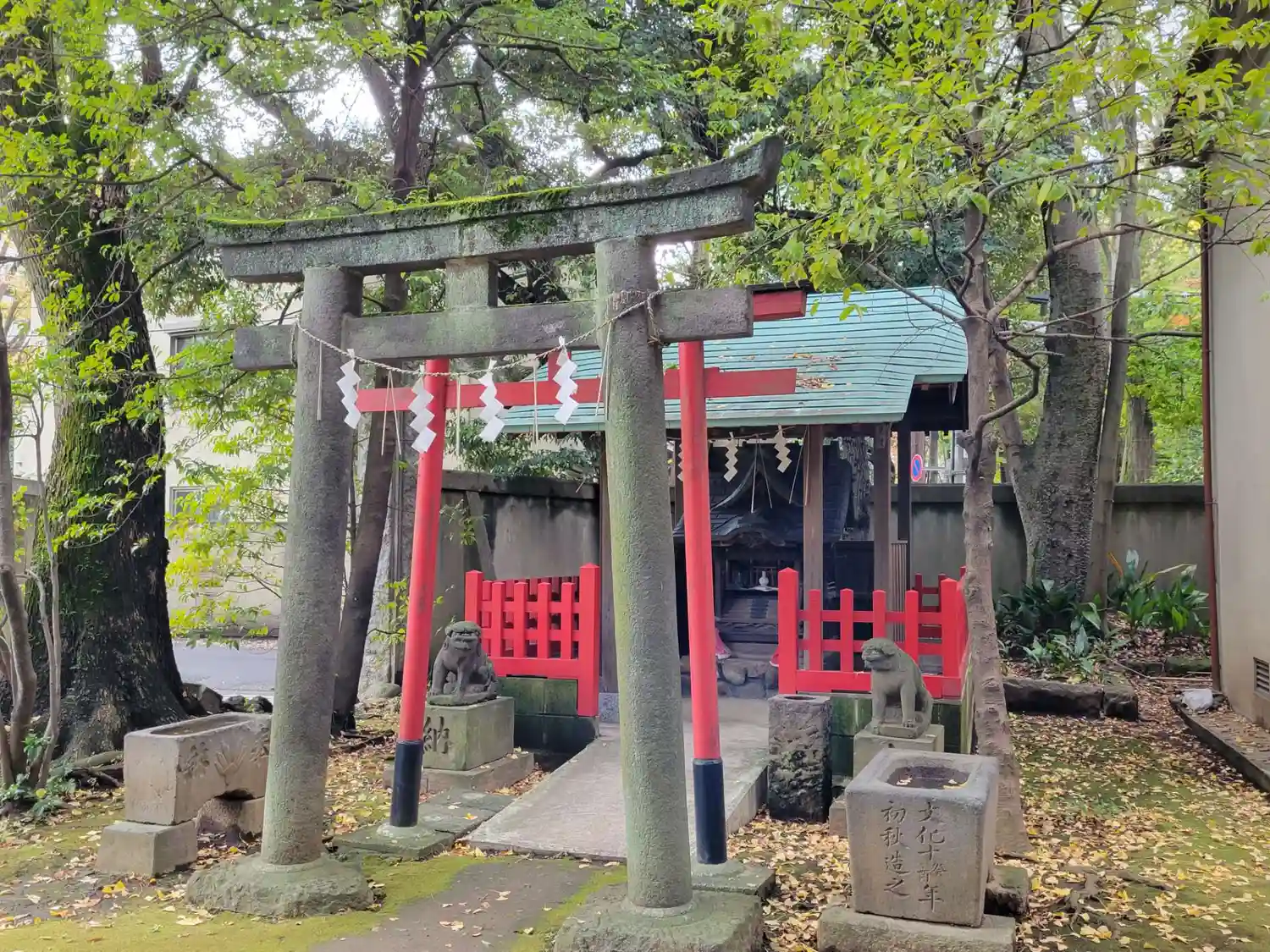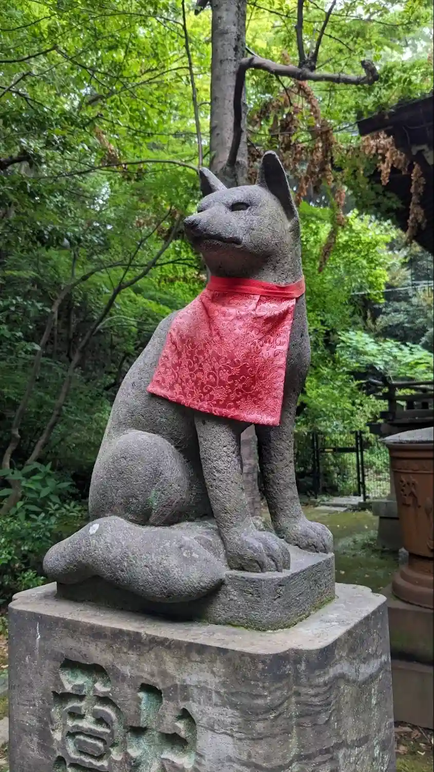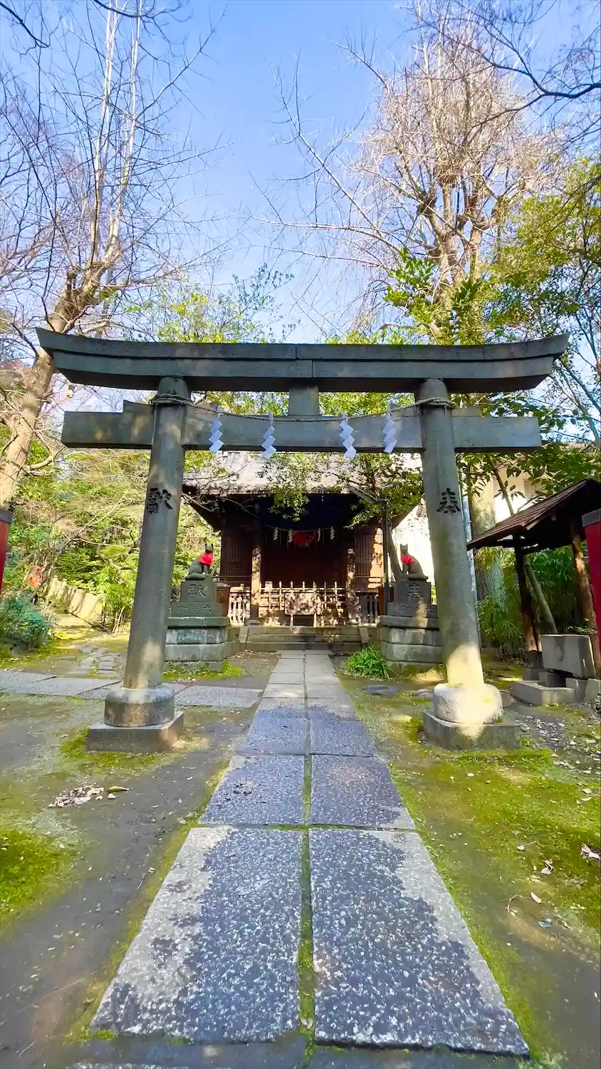 終戦後、赤坂3丁目にあった山口邸から遷された神社です。鳥居には享保3年(1718年)銘があり、向かって右側の水盤には文化10年(1813年)、左側の水盤には嘉永4年(1851年)、狛犬の台座には文政8年(1825年)の文字が刻まれていています。