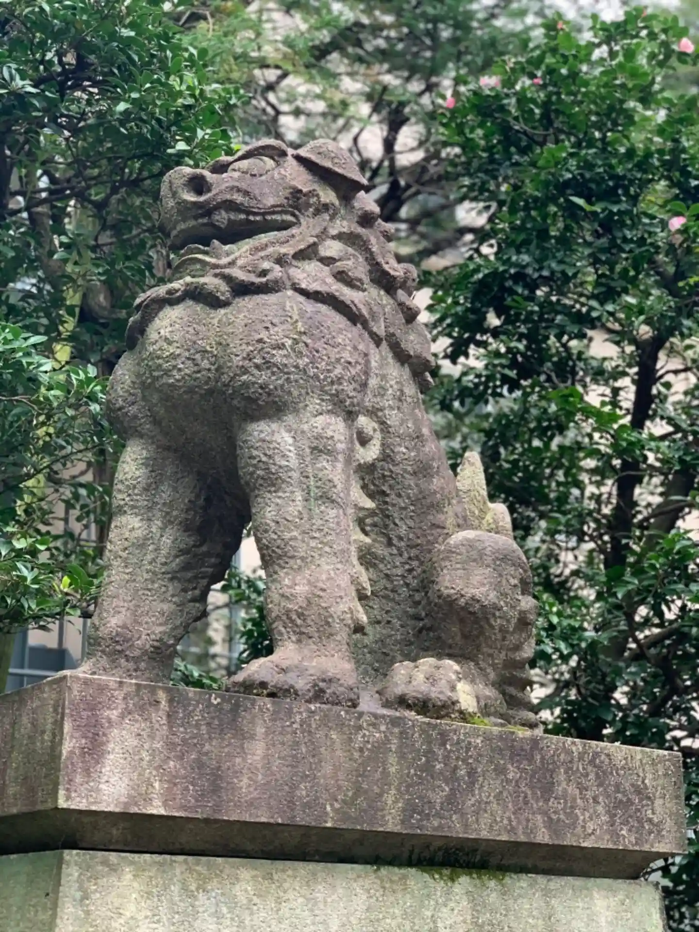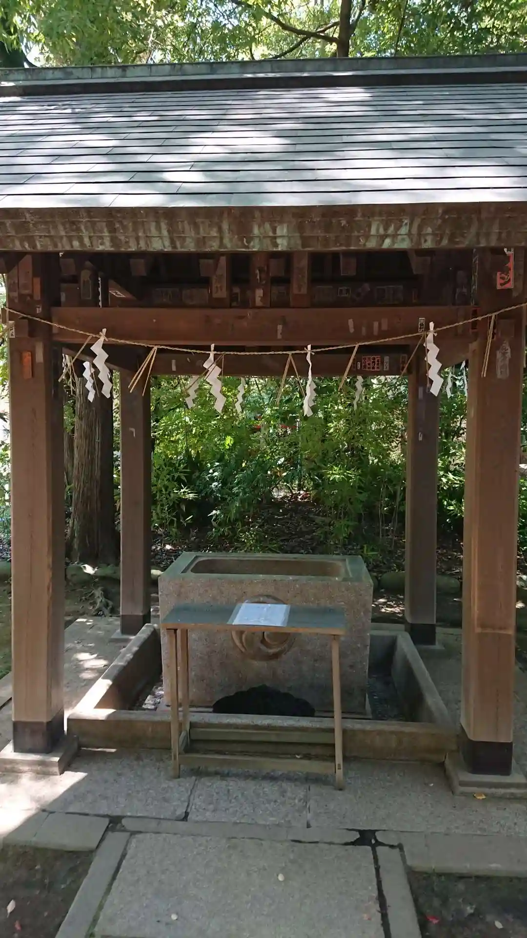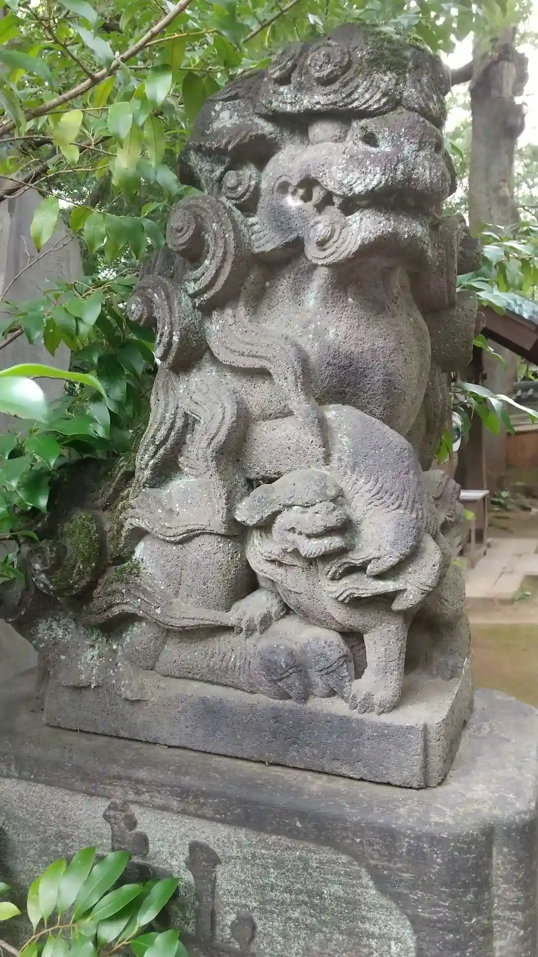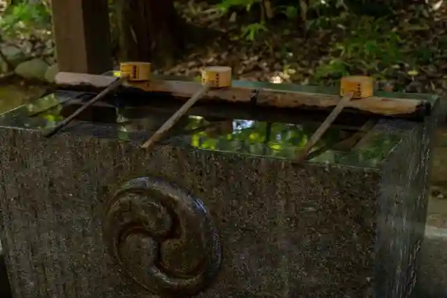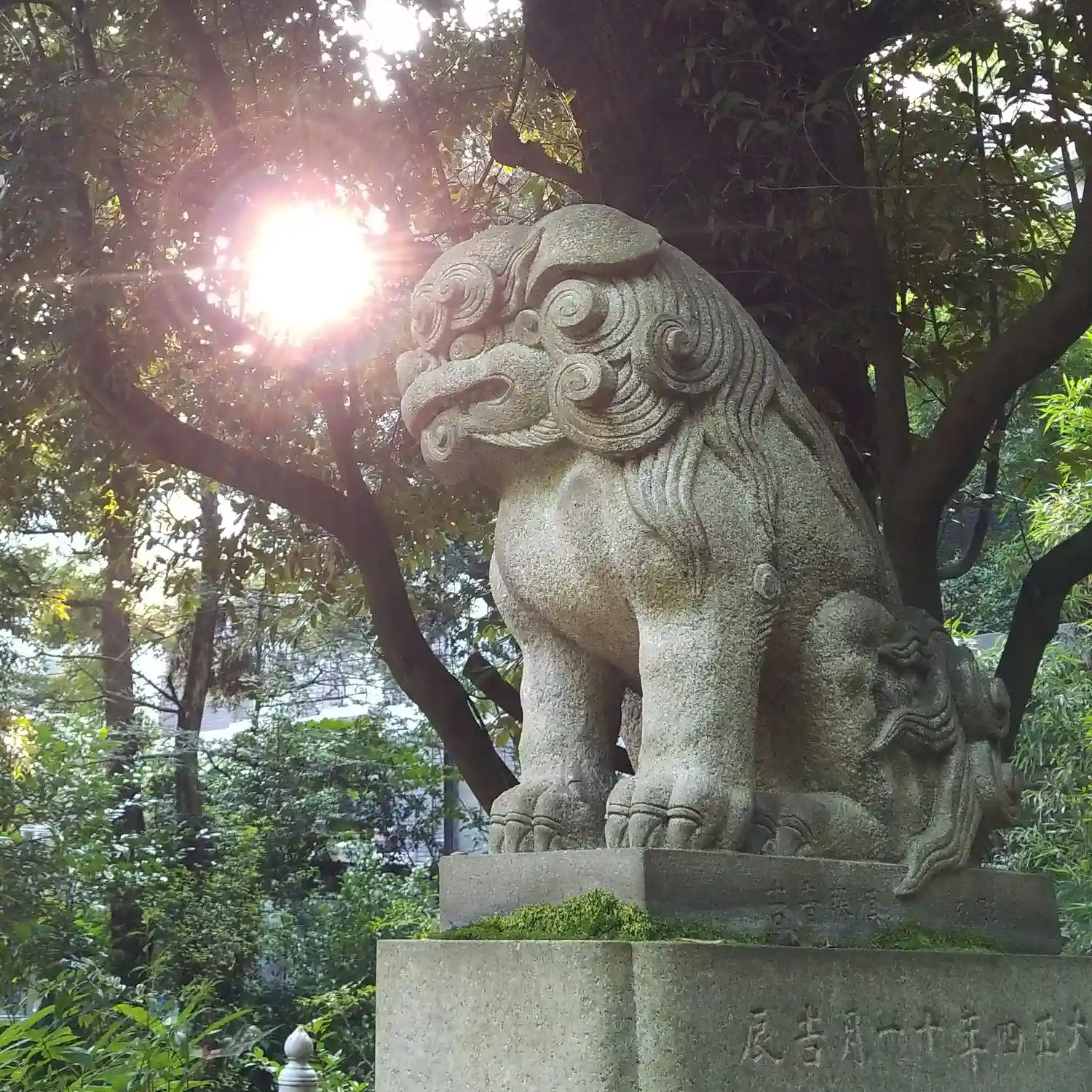 終戦後、赤坂3丁目にあった山口邸から遷された神社です。鳥居には享保3年(1718年)銘があり、向かって右側の水盤には文化10年(1813年)、左側の水盤には嘉永4年(1851年)、狛犬の台座には文政8年(1825年)の文字が刻まれていています。