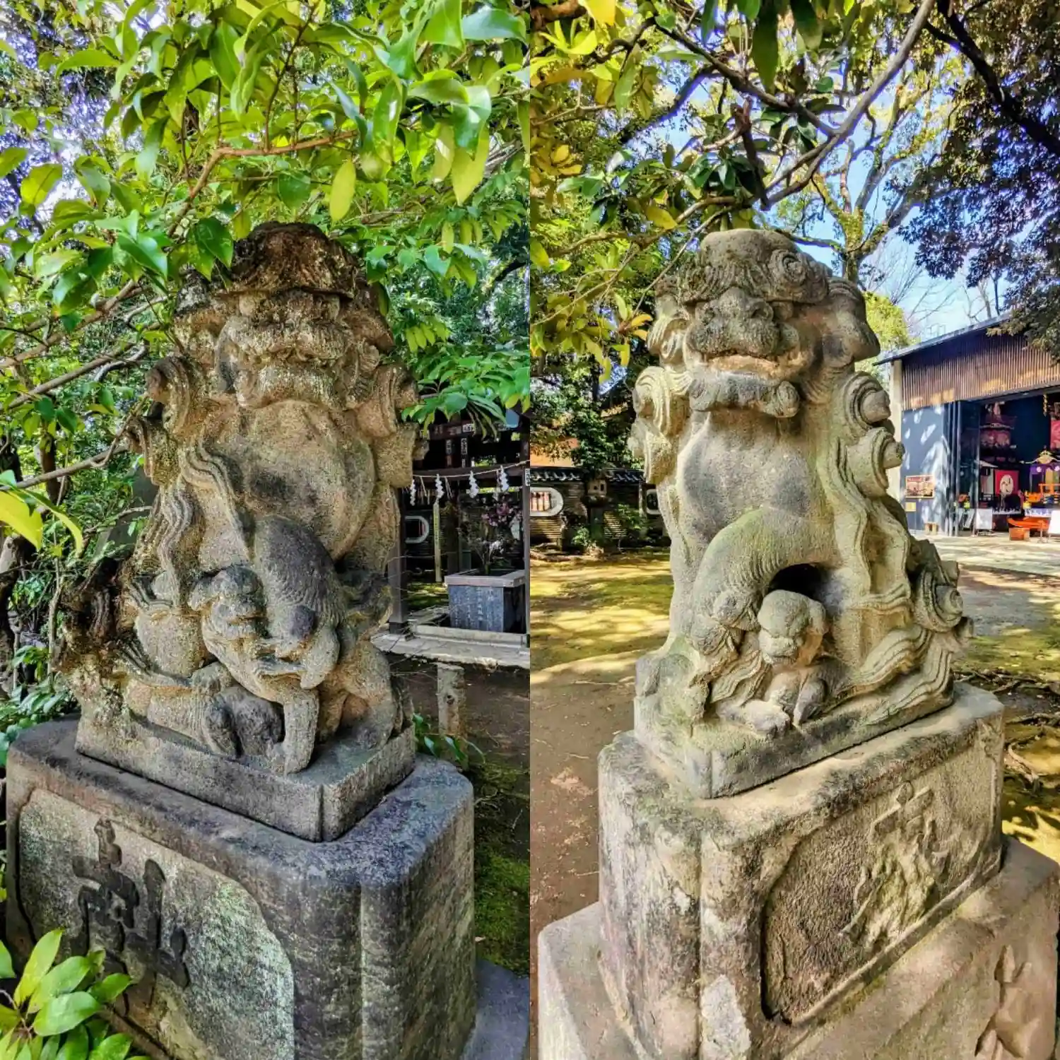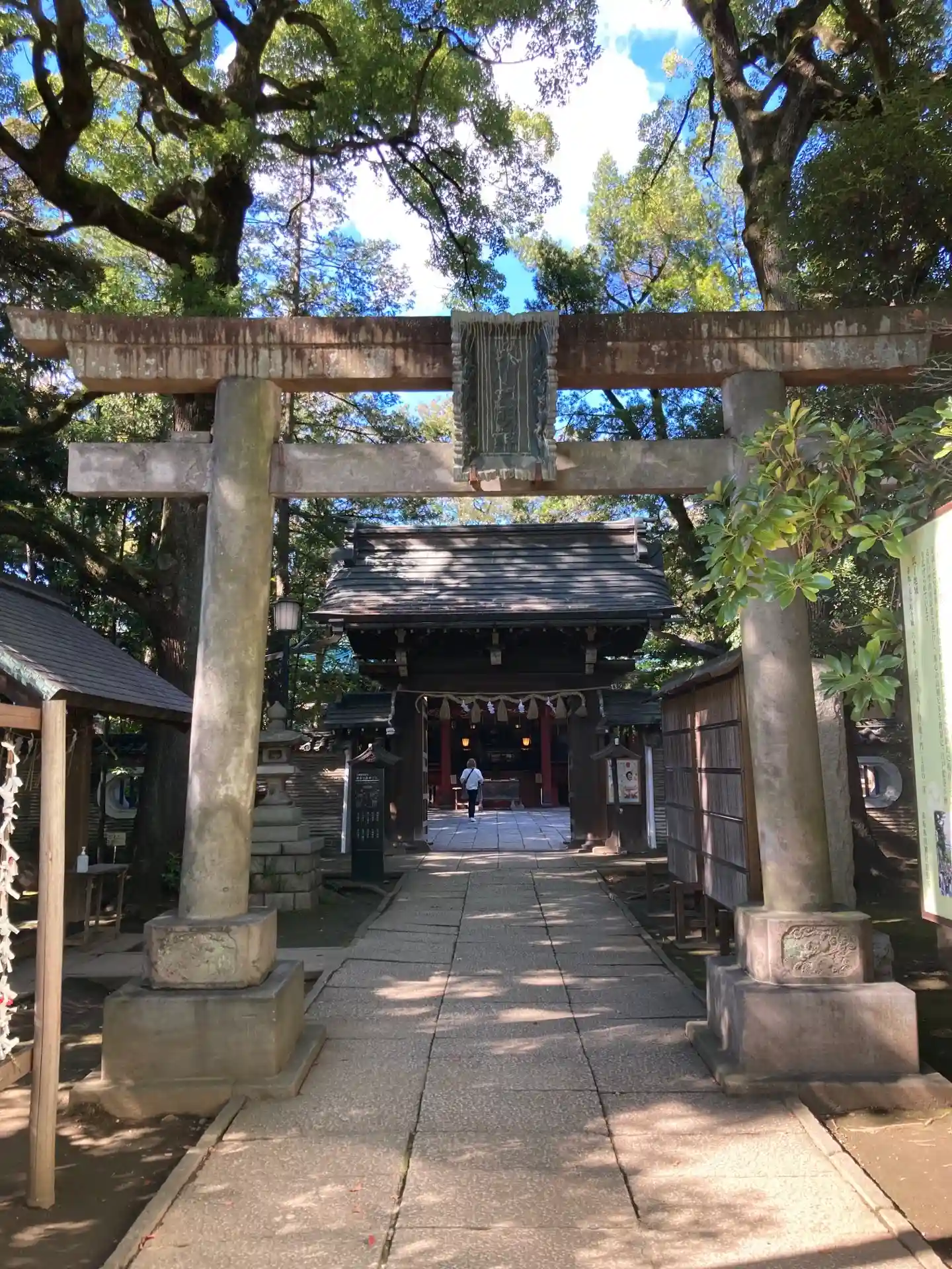 境内には南側の参道と東側の参道にそれぞれ2基ずつ鳥居があります。このうち、一の鳥居(南側)には「大正十一壬戌年九月」「麻布 芝 氏子中」と記されており、麻布•芝周辺まで信仰が及んでいたことを物語っています。また一の鳥居には「御即位記念 寄附 苗村又右衛門」の銘があり、大正4年(1915年)11月の大正天皇即位の礼に合わせて、氏子惣代の苗村又右衛門から奉納されたことがわかります。