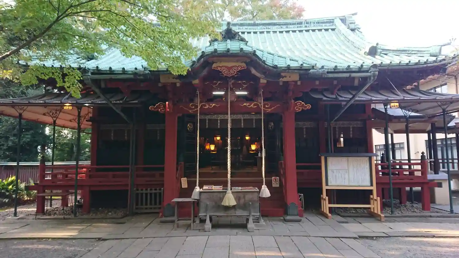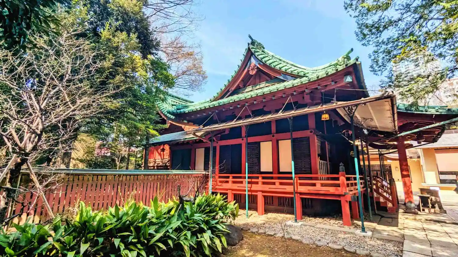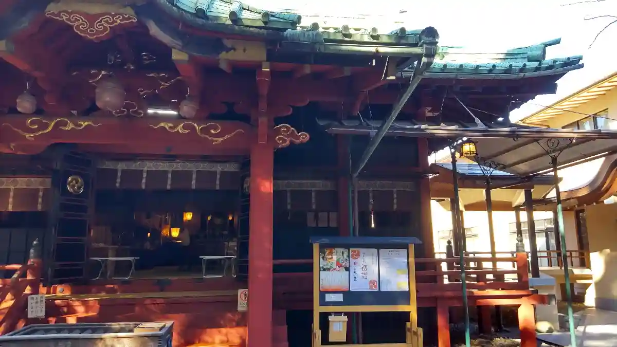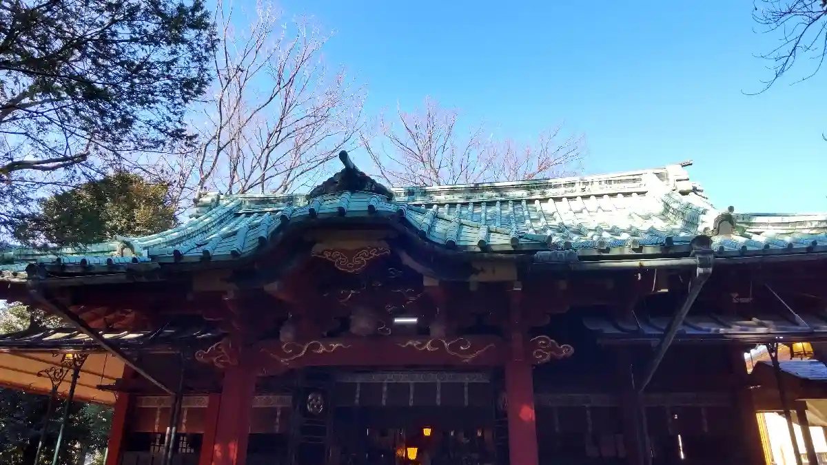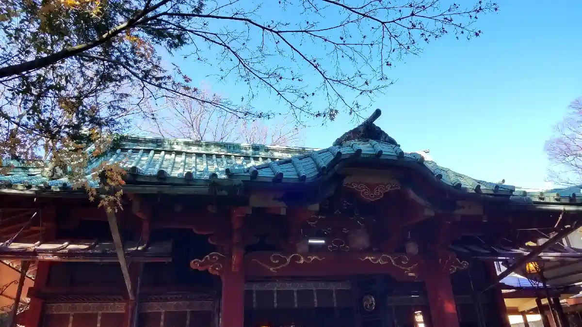 社殿。権現造。関東大震災や東京大空襲を奇跡的に被災せず、江戸当時のままの姿を残しています。東京都の有形文化財に指定されています。