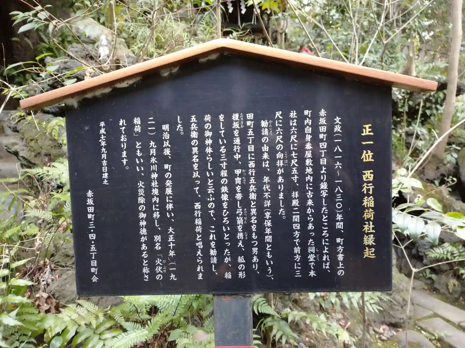 文政8年~11年(1825年~1828年)に調査された『町方書上』によると、もともとは赤坂田町4 丁目に鎮座していたようです。同5丁目に住んでいた西行五兵衛という男が、甲冑を身にまとい、弓矢を携えて狐に乗った姿の鉄の像を拾い、御神体として安置したことが創建の由来と伝えられ、「火伏の稲荷」として信仰されてきました。