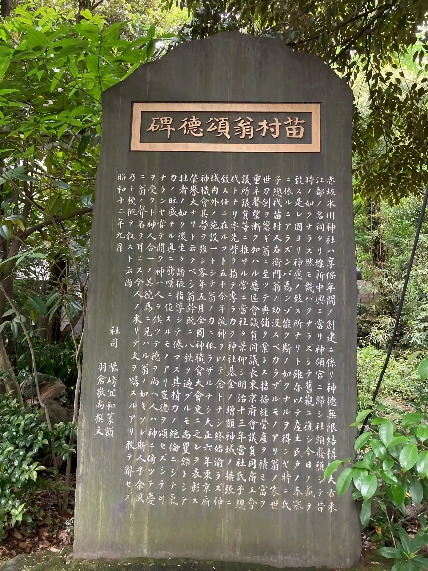 明治、大正期の氏子総代で当社再興に尽力した苗村又右衛門翁頌徳碑。