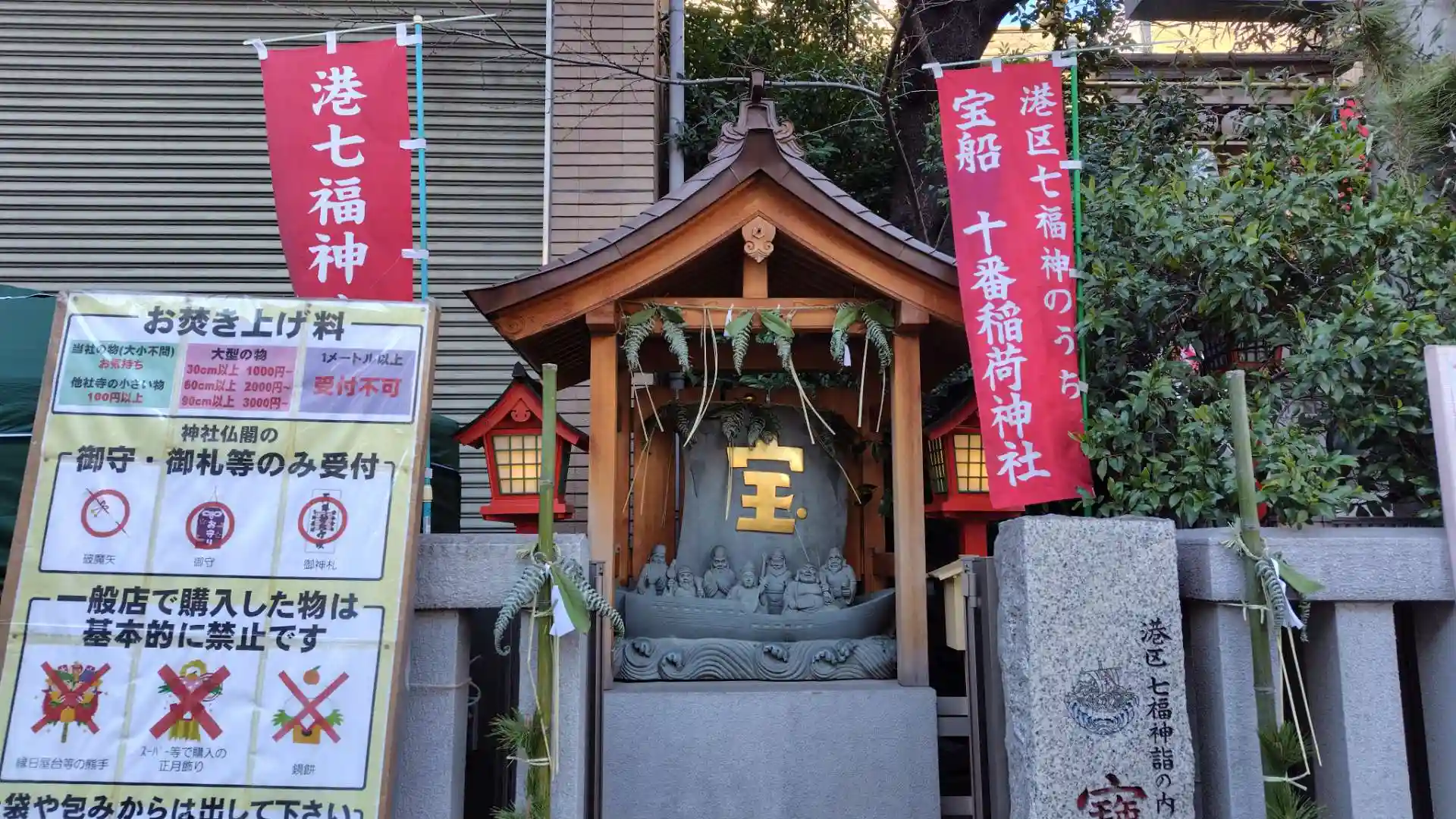 外堀通りを渡ったところに十番稲荷神社がある。こちらは「七福神」ではないが「宝船」の場所。宝船自体は拝殿に登る石段の向かって左側に祀られている。急な石段を登った拝殿でお参り。