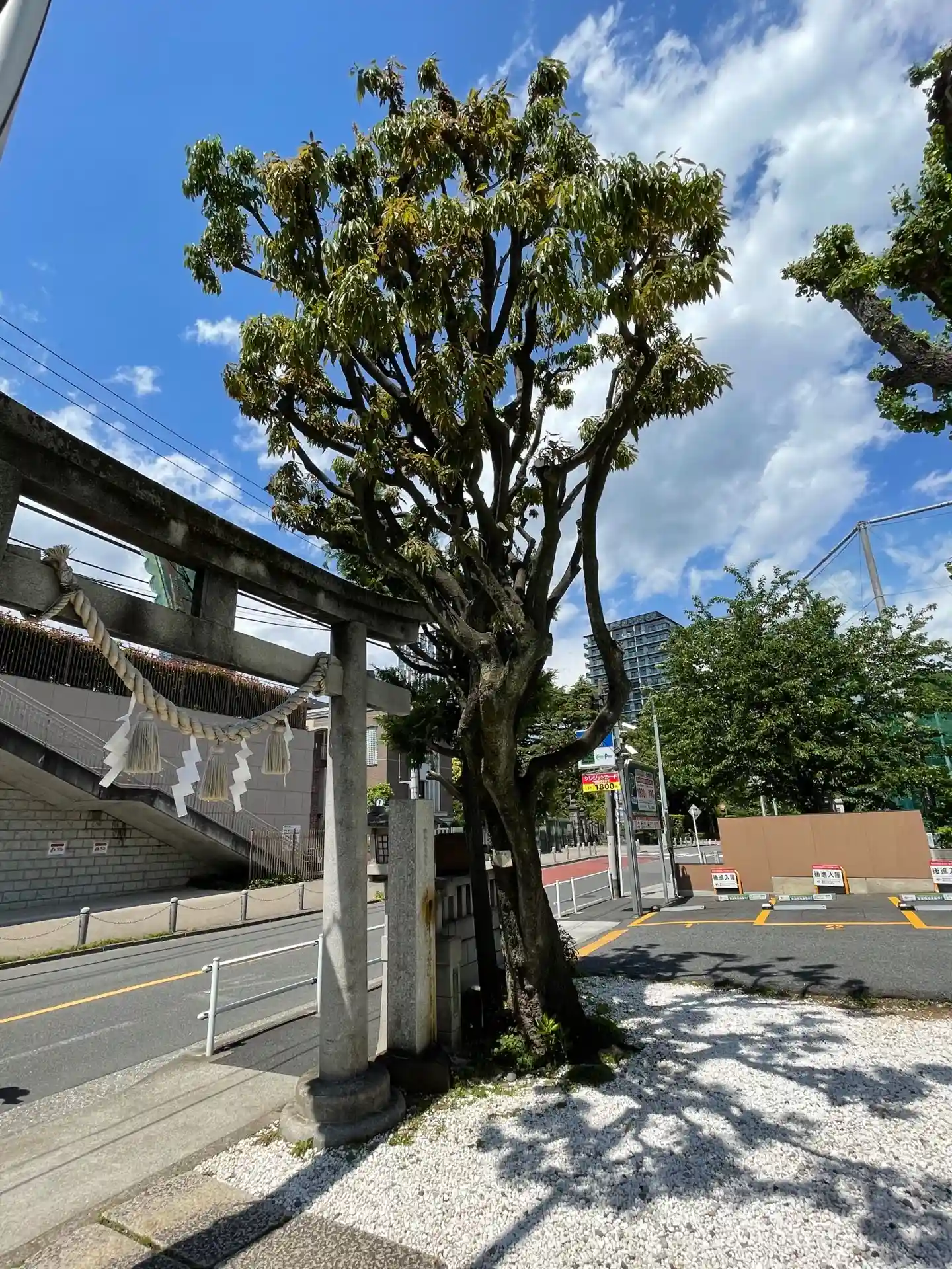 芝公園の裏手にある幸稲荷神社。白石が眩しく明るい感じの神社でした。港区保護樹木のシラカシ、ちょっと珍しい木です。