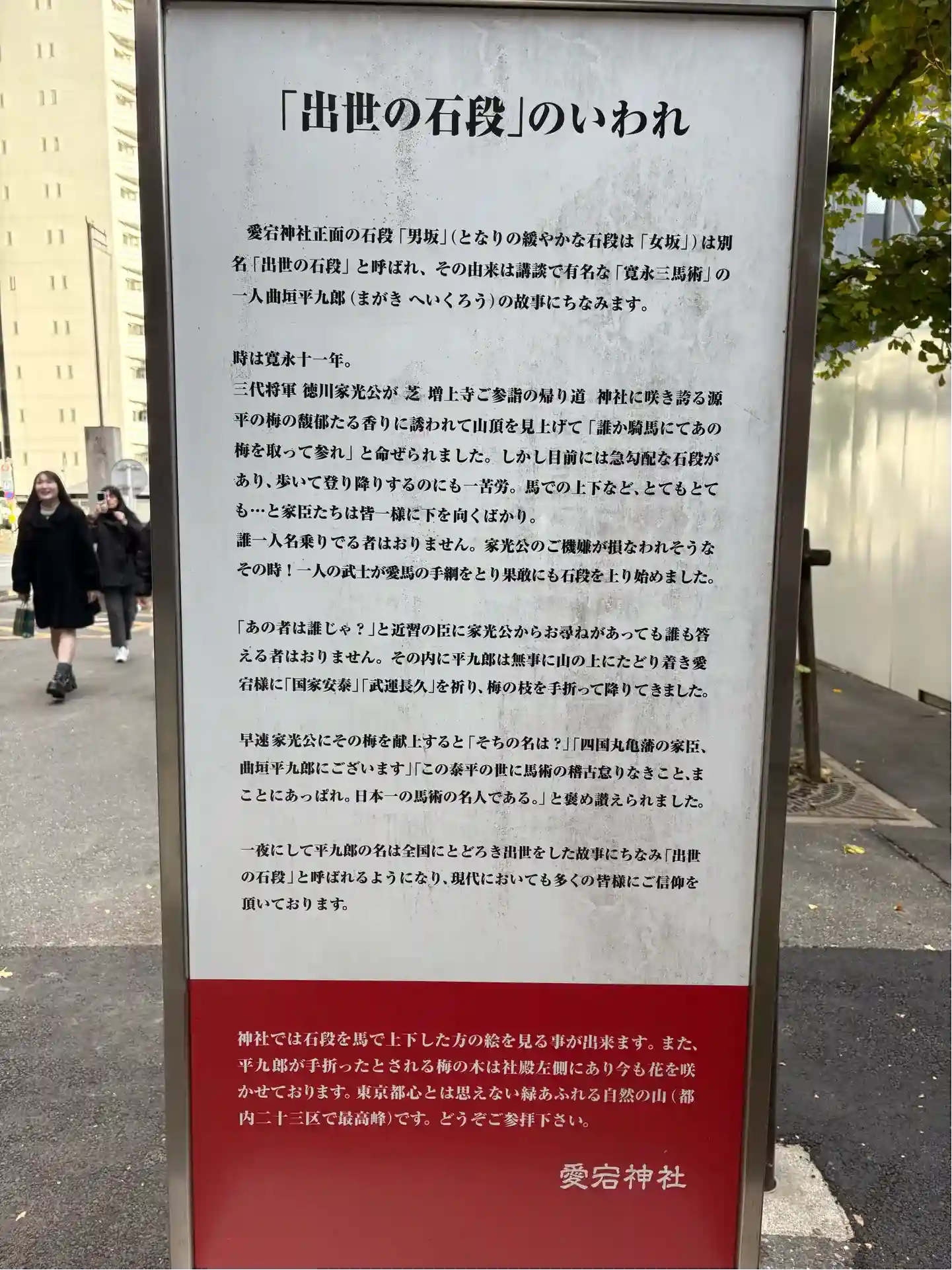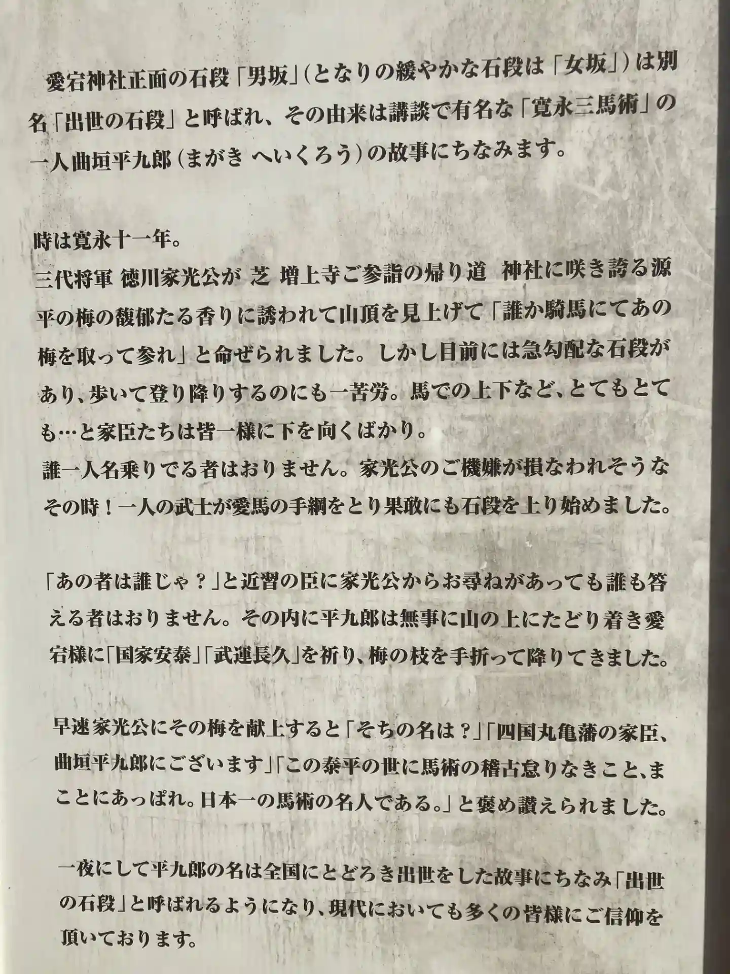 [顔はめパネル]曲垣平九郎とは馬で男坂の階段を一気に駆け上がり紅白の梅の枝を折って徳川家光に献上したと言われている方です