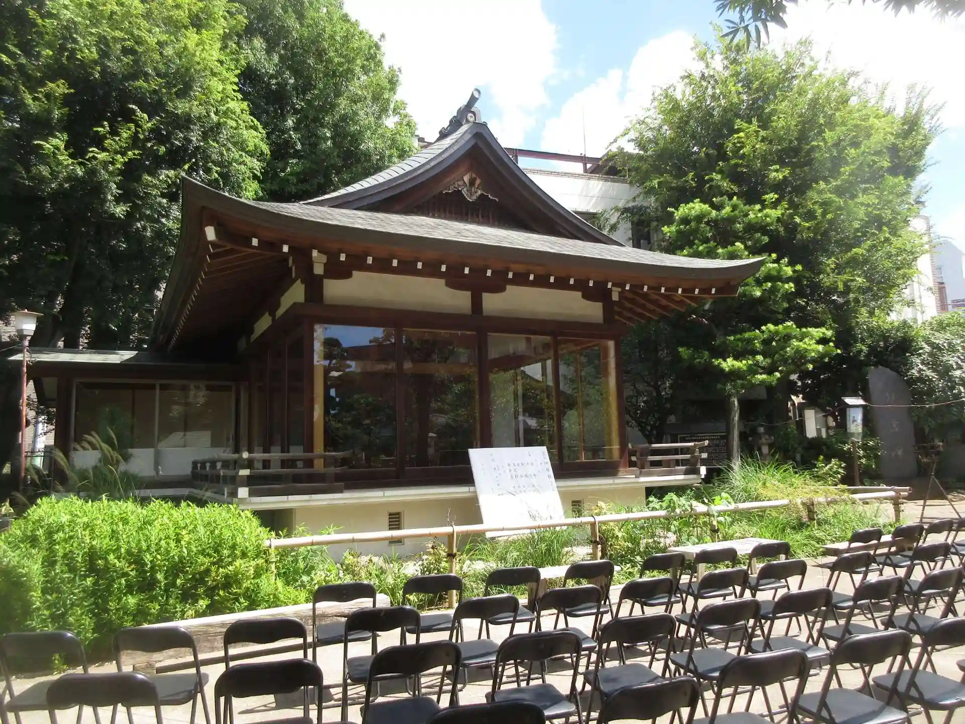 舞殿ではこれから何かが行われるようでその前にはパイプ椅子が並べられている。