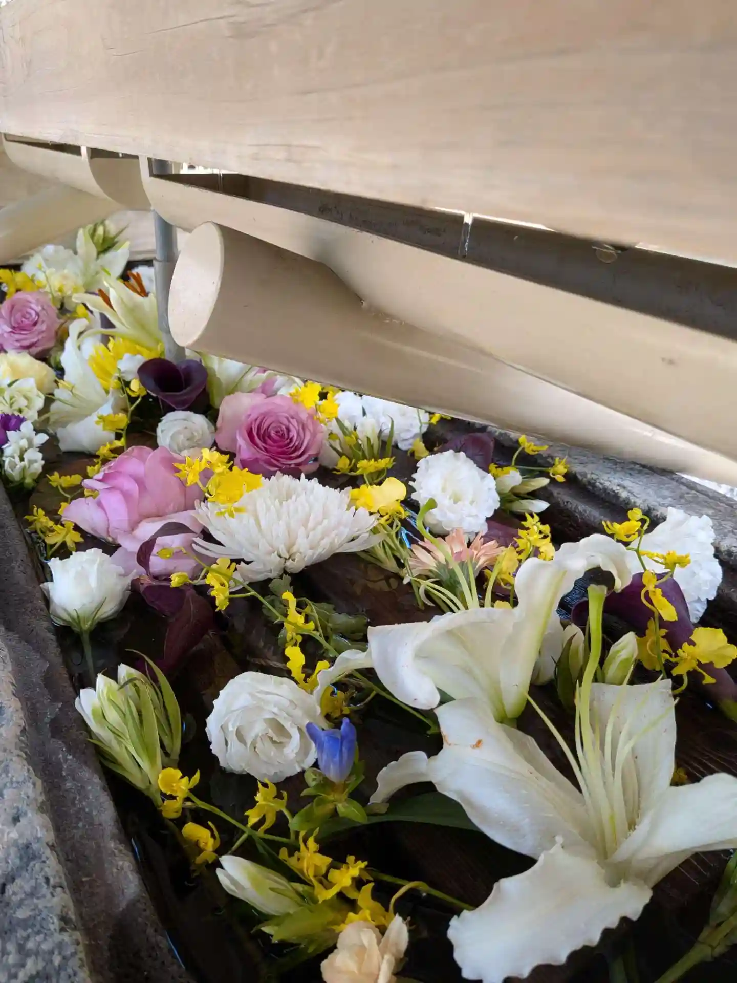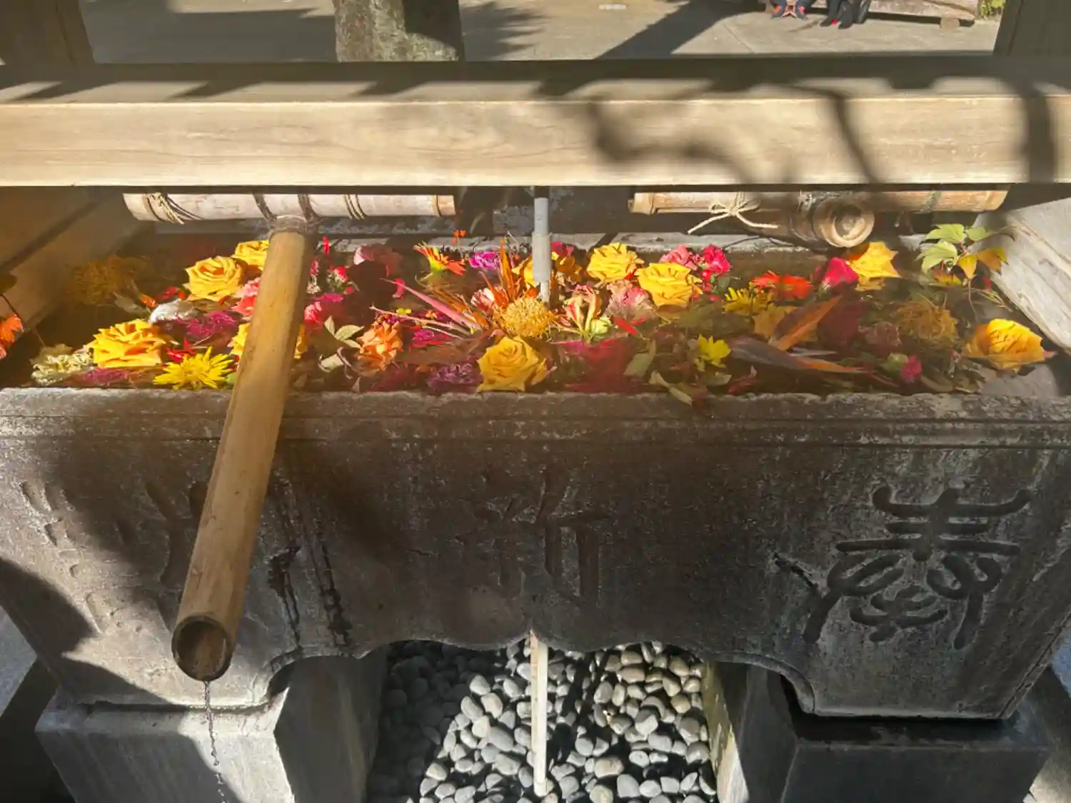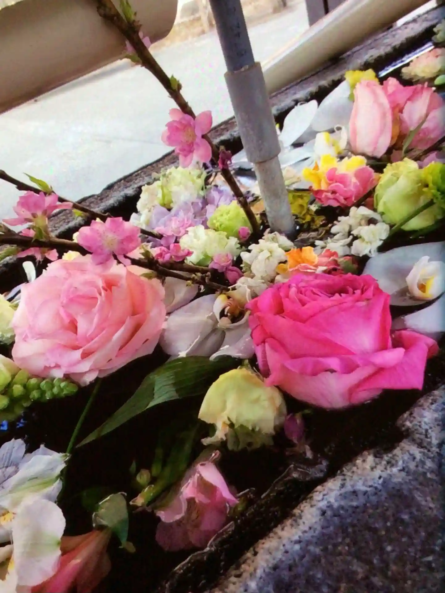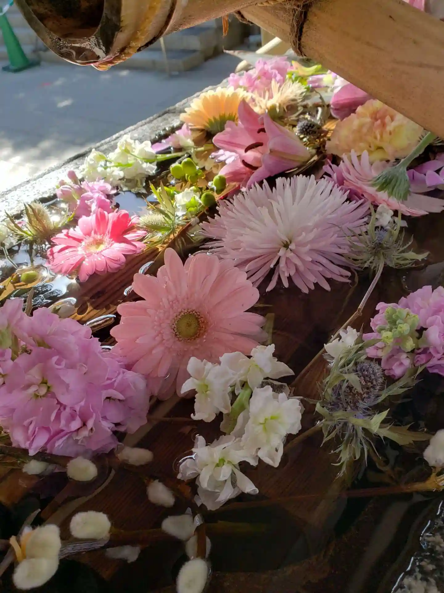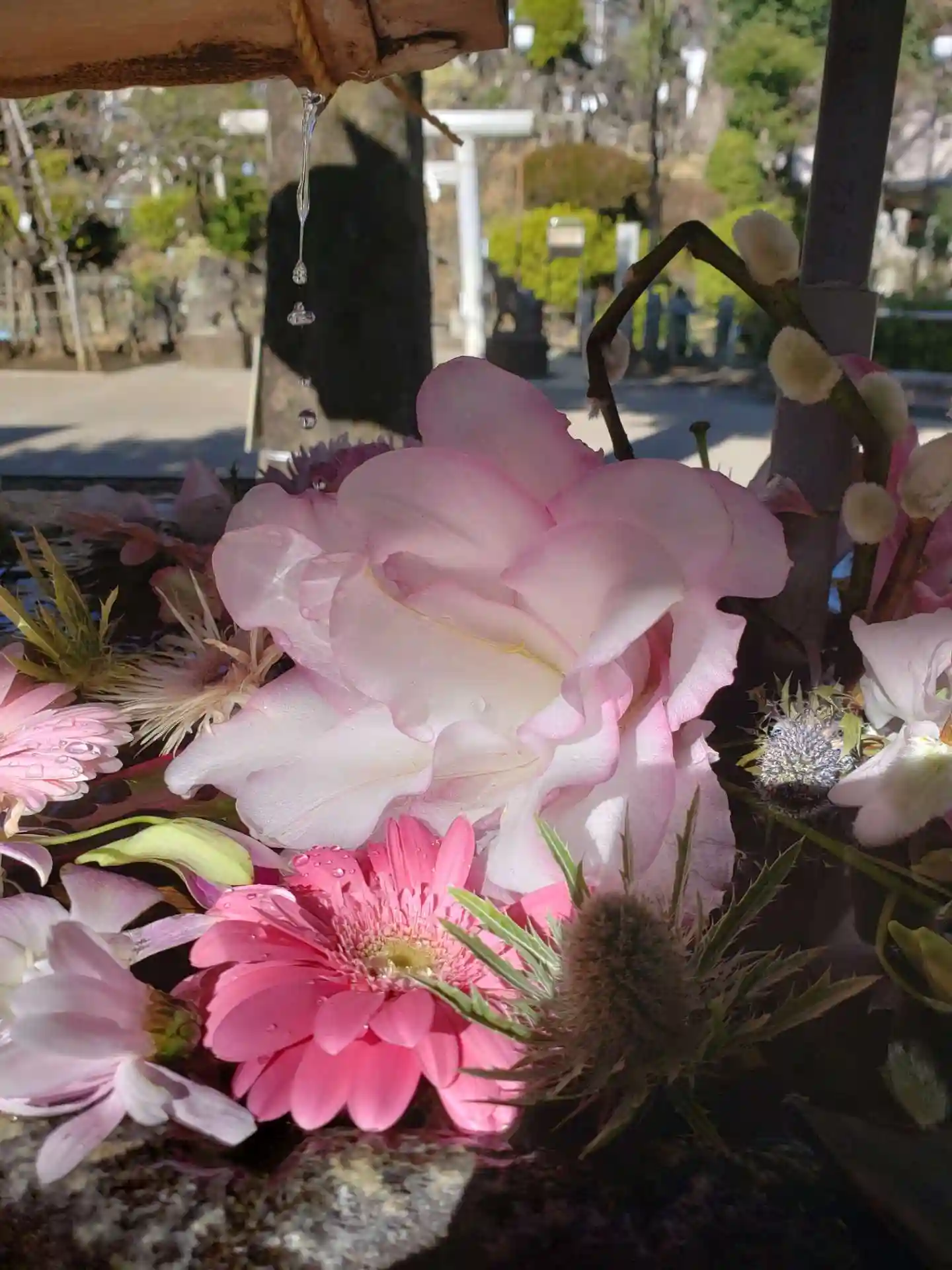 花手水が新しく入れ替えされて、淡い色合いで可愛い花手水に癒されました。