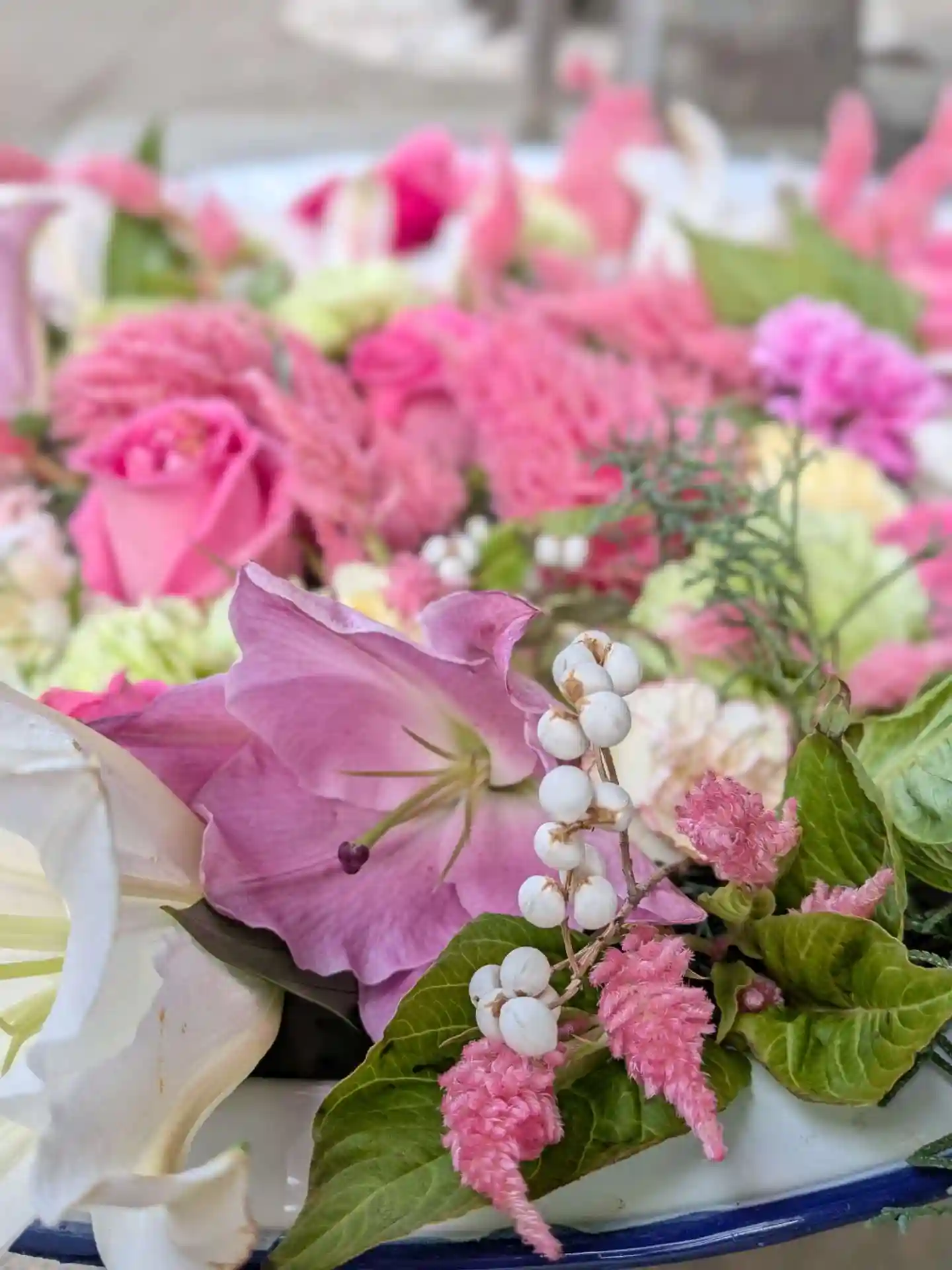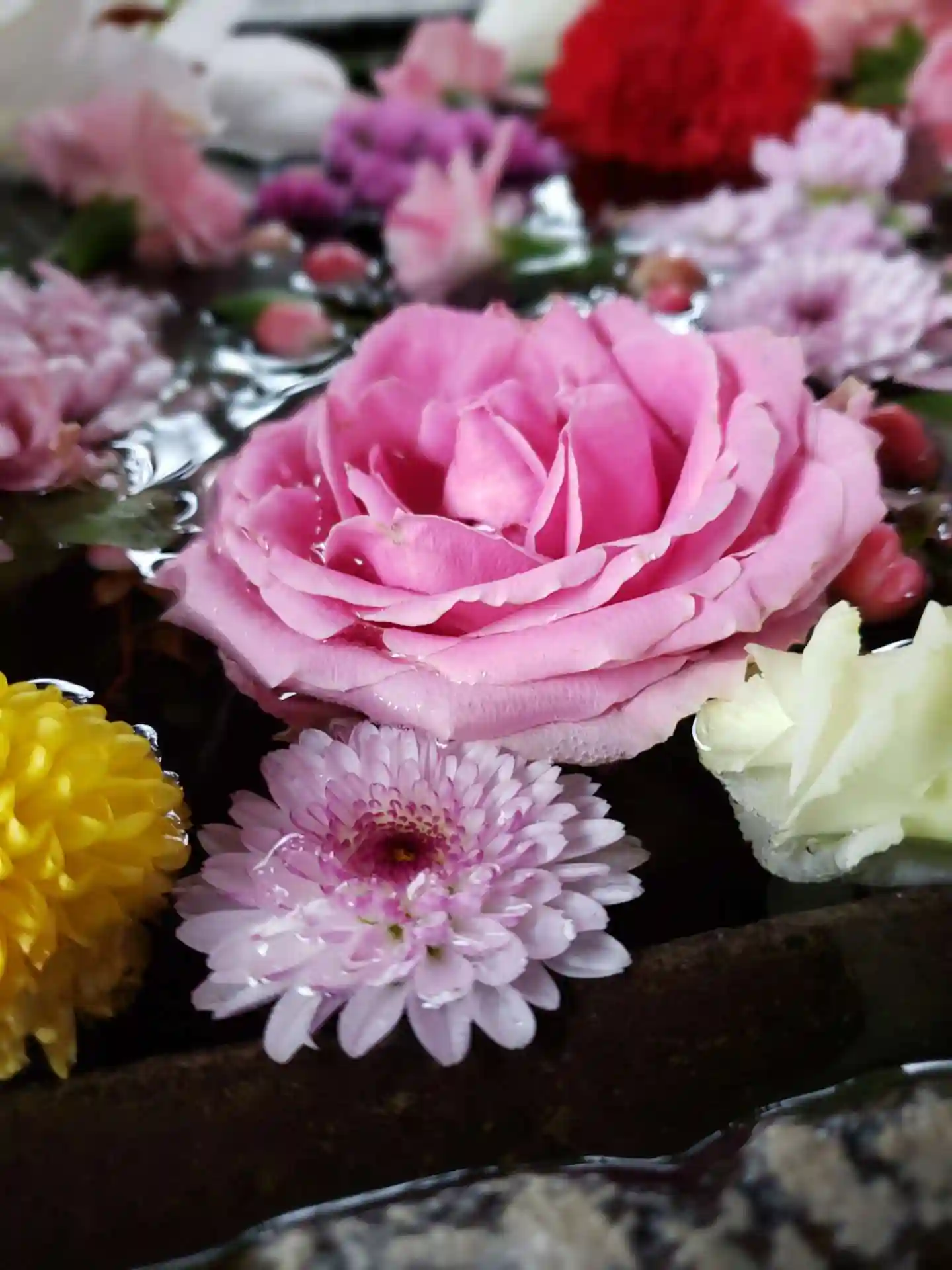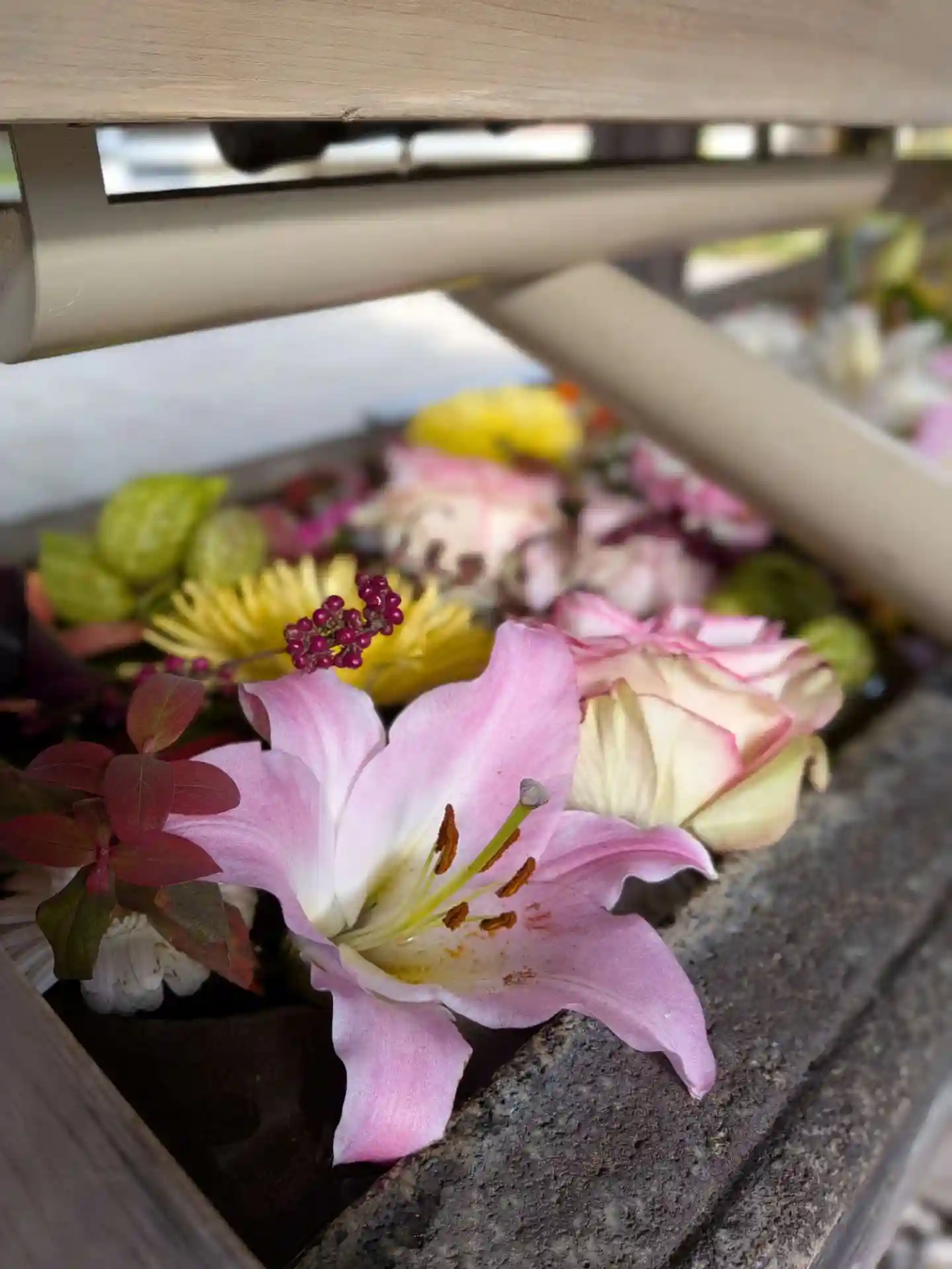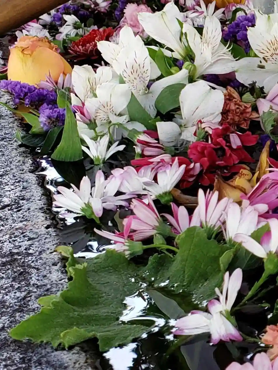 花手水が新しく入れ替えされて、淡い色合いで可愛い花手水に癒されました。