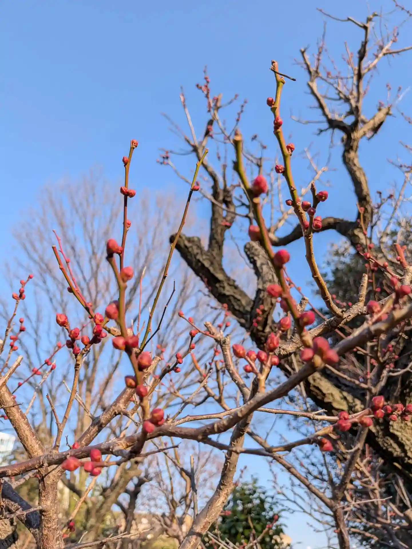千駄ヶ谷は、紅梅の開花が始まった鳩森八幡神社さんから、ーあちら…